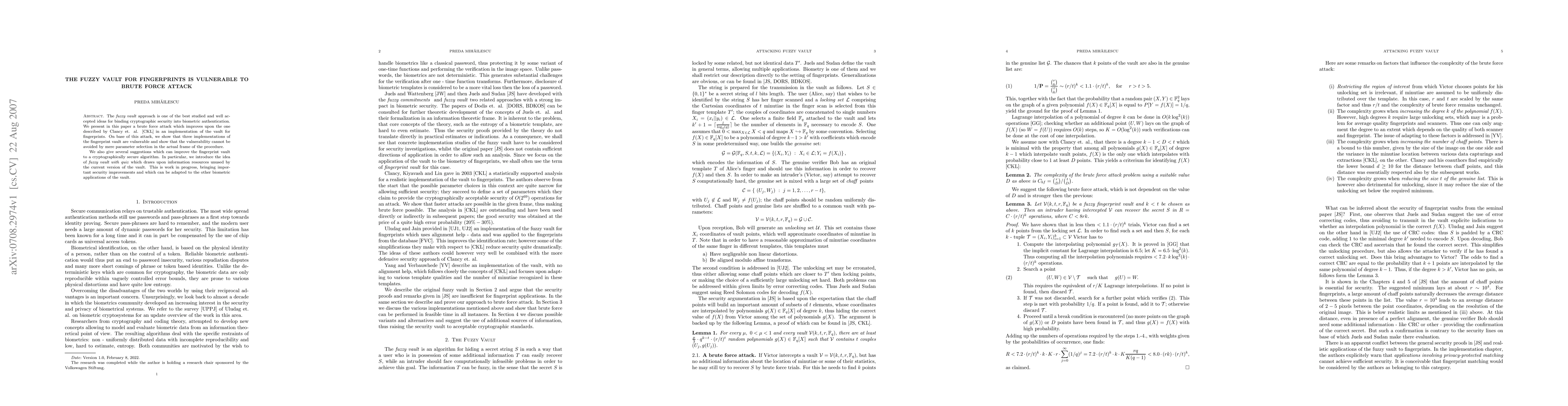 The \textit{fuzzy vault} approach is one of the best studied and well accepted ideas for binding cryptographic security into biometric authentication. The vault has been implemented in connection with fingerprint data by Uludag and Jain. We show that this instance of the vault is vulnerable to brute force attack. An interceptor of the vault data can recover both secret and template data using only generally affordable computational resources. Some possible alternatives are then discussed and it is suggested that cryptographic security may be preferable to the one - way function approach to biometric security.
