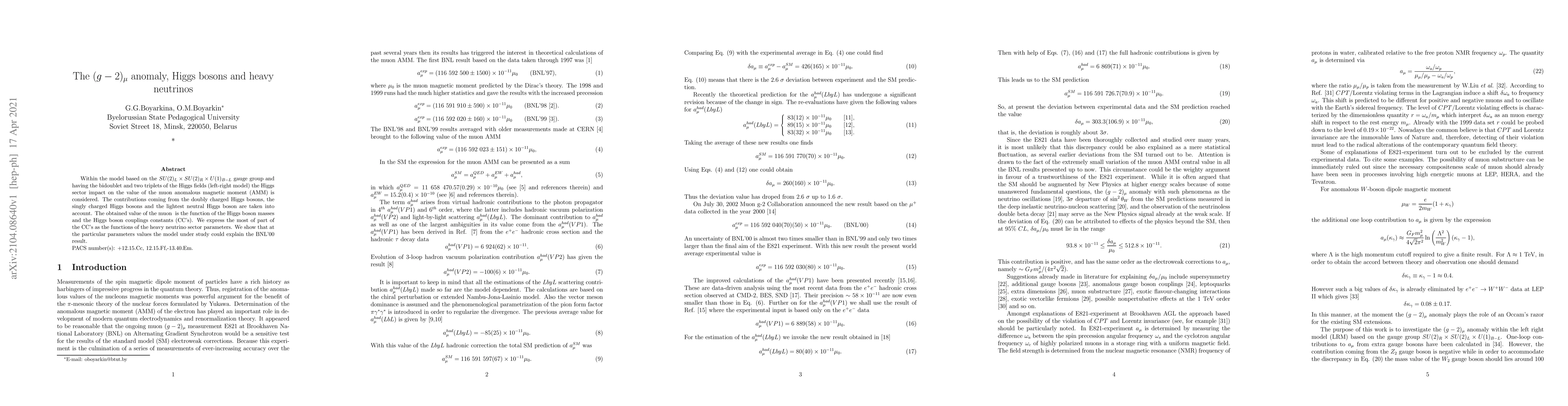Within the model based on the $SU (2)_L\times SU (2)_R\times U (1)_{B-L} $ gauge group and having the bidoublet and two triplets of the Higgs fields (left-right model) the Higgs sector impact on the value of the muon anomalous magnetic moment is considered. The contributions coming from the doubly charged Higgs bosons, the singly charged Higgs bosons and the lightest neutral Higgs boson are taken into account. The obtained value of the muon anomalous magnetic moment is the function of the Higgs boson masses and the Higgs boson couplings constants (CC's). We express the most of part of the CC's as the functions of the heavy neutrino sector parameters. We show that at the particular parameters values the model under study could explain the BNL'00 result.