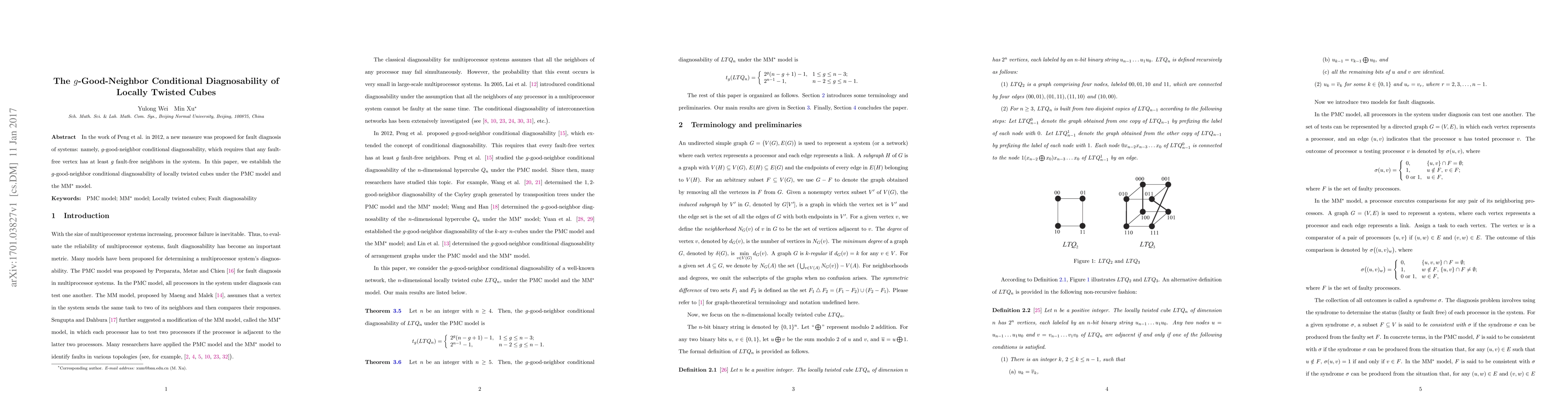 This paper establishes the g-good-neighbor conditional diagnosability of locally twisted cubes under two fault-tolerance models, PMC and MM^*. It builds on the 2012 proposal by Peng et al. for a new fault diagnosis measure.