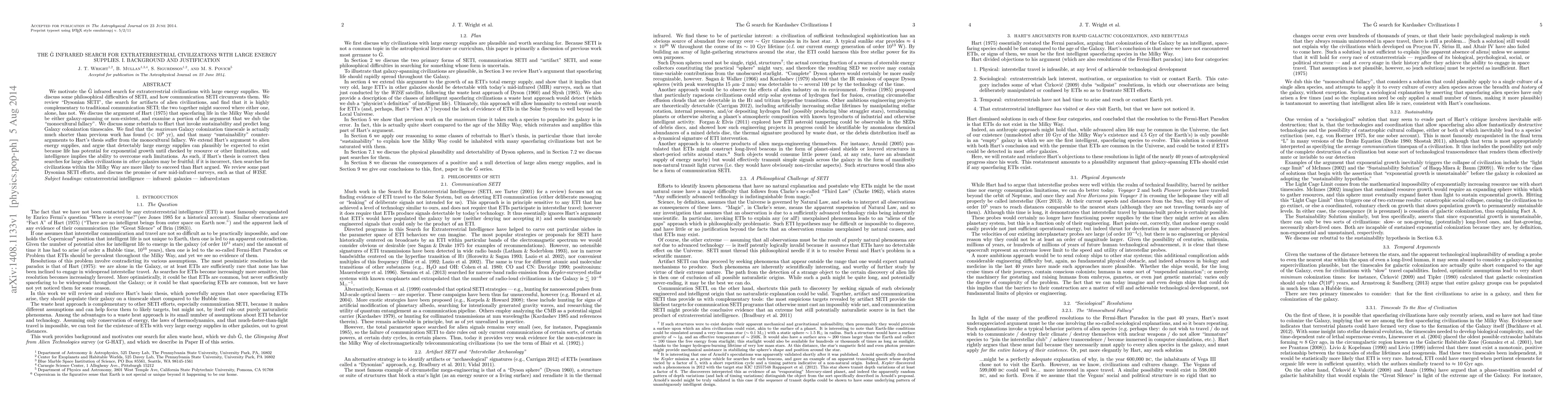 We motivate the \^G infrared search for extraterrestrial civilizations with large energy supplies. We discuss some philosophical difficulties of SETI, and how communication SETI circumvents them. We review "Dysonian SETI", the search for artifacts of alien civilizations, and find that it is highly complementary to traditional communication SETI; the two together might succeed where either one, alone, has not. We discuss the argument of Hart (1975) that spacefaring life in the Milky Way should be either galaxy-spanning or non-existent, and examine a portion of his argument that we dub the "monocultural fallacy". We discuss some rebuttals to Hart that invoke sustainability and predict long Galaxy colonization timescales. We find that the maximum Galaxy colonization timescale is actually much shorter than previous work has found ($< 10^9$ yr), and that many "sustainability" counter-arguments to Hart's thesis suffer from the monocultural fallacy. We extend Hart's argument to alien energy supplies, and argue that detectably large energy supplies can plausibly be expected to exist because life has potential for exponential growth until checked by resource or other limitations, and intelligence implies the ability to overcome such limitations. As such, if Hart's thesis is correct then searches for large alien civilizations in other galaxies may be fruitful; if it is incorrect, then searches for civilizations within the Milky Way are more likely to succeed than Hart argued. We review some past Dysonian SETI efforts, and discuss the promise of new mid-infrared surveys, such as that of WISE.