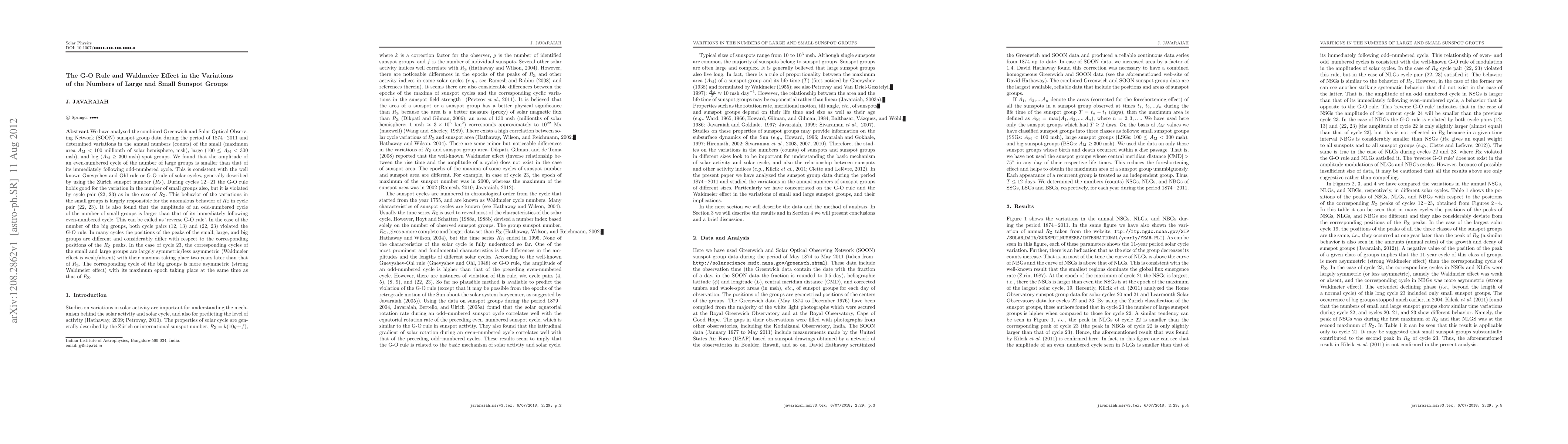 This study analyzes sunspot group data from 1874-2011, revealing variations in the number of small, large, and big sunspot groups. The G-O rule is observed in large groups, while the reverse G-O rule applies to small groups. The big groups violate the G-O rule in cycles 12-13 and 22-23. Cycle 23 shows a weak Waldmeier effect for small and large groups, with peaks two years after Rz, and a strong effect for big groups, peaking simultaneously with Rz.