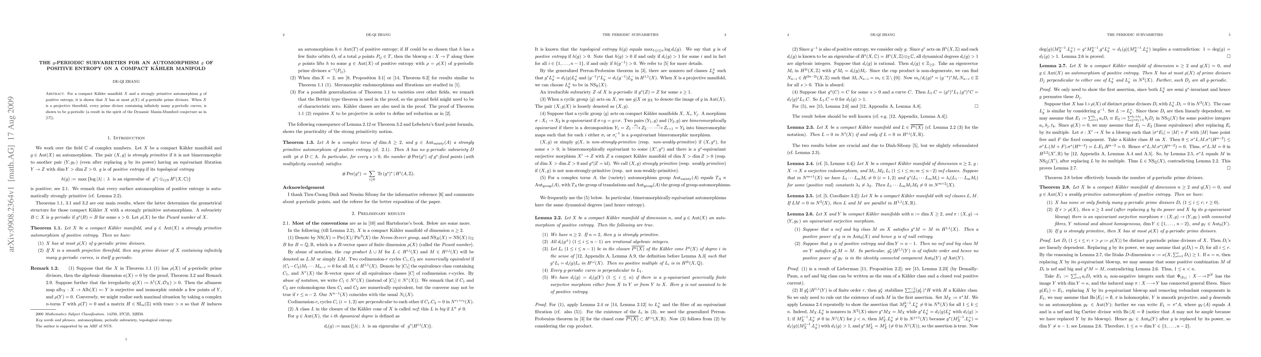 For a compact Kahler manifold X and a strongly primitive automorphism g of positive entropy, it is shown that X has at most rank NS(X) of g-periodic prime divisors B_i (i.e., g^s(B_i) = B_i for some s > 0). When X is a projective threefold, every prime divisor containing infinitely many g-periodic curves, is shown to be g-periodic itself (a result in the spirit of the Dynamic Manin-Mumford conjecture).