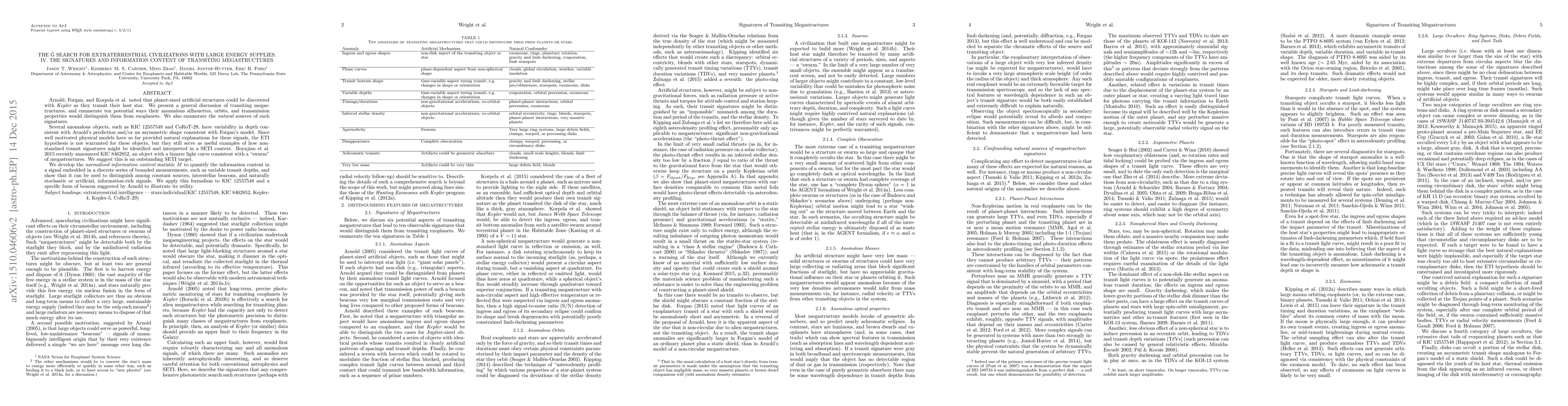 This paper discusses the detection of extraterrestrial megastructures via Kepler's transit method, presenting ten distinguishing features from exoplanets. It introduces the normalized information content statistic $M$ to differentiate constant sources, interstellar beacons, and artificial signals. While natural explanations exist for some anomalous objects, KIC 8462852 is highlighted as a promising SETI target due to its unusual light curve.