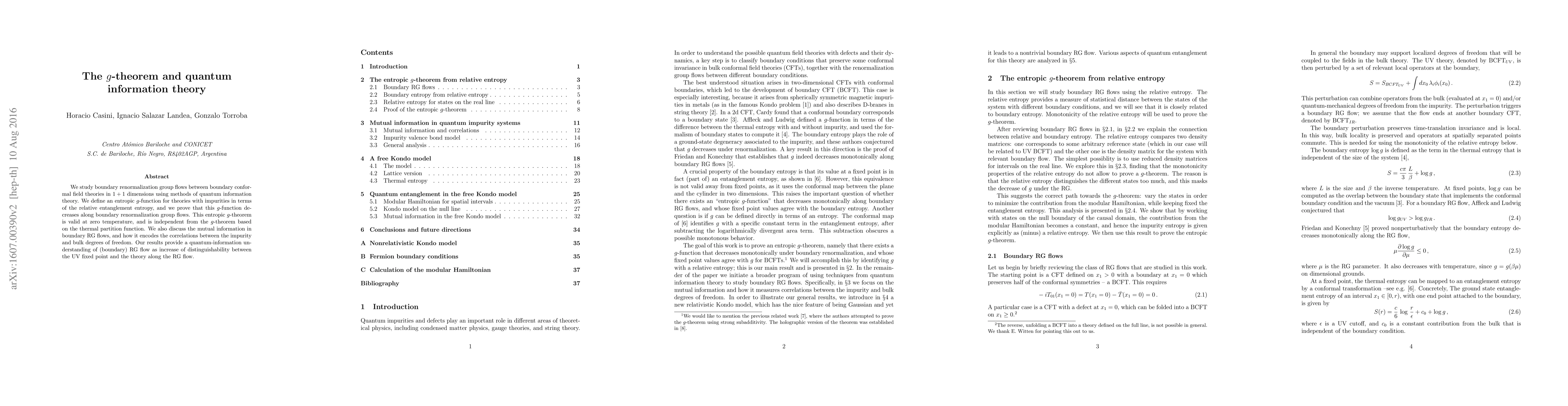 We study boundary renormalization group flows between boundary conformal field theories in $1+1$ dimensions using methods of quantum information theory. We define an entropic $g$-function for theories with impurities in terms of the relative entanglement entropy, and we prove that this $g$-function decreases along boundary renormalization group flows. This entropic $g$-theorem is valid at zero temperature, and is independent from the $g$-theorem based on the thermal partition function. We also discuss the mutual information in boundary RG flows, and how it encodes the correlations between the impurity and bulk degrees of freedom. Our results provide a quantum-information understanding of (boundary) RG flow as increase of distinguishability between the UV fixed point and the theory along the RG flow.