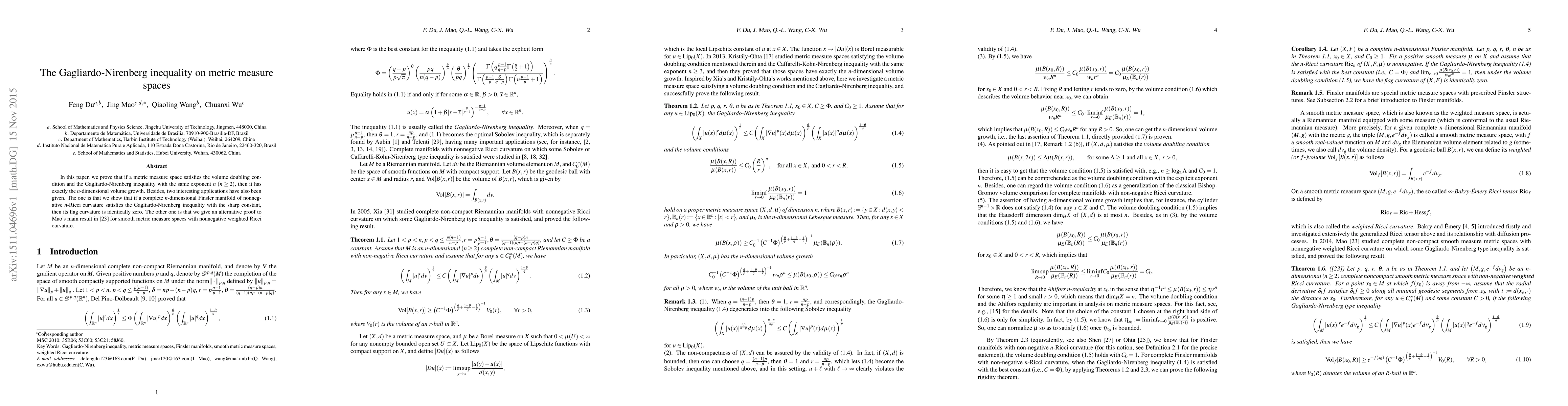 This paper proves that metric measure spaces satisfying the volume doubling condition and the Gagliardo-Nirenberg inequality with exponent $n$ exhibit $n$-dimensional volume growth. It also demonstrates that $n$-dimensional Finsler manifolds with nonnegative $n$-Ricci curvature and optimal Gagliardo-Nirenberg inequality have zero flag curvature, and provides an alternative proof for Mao's result on smooth spaces with nonnegative weighted Ricci curvature.