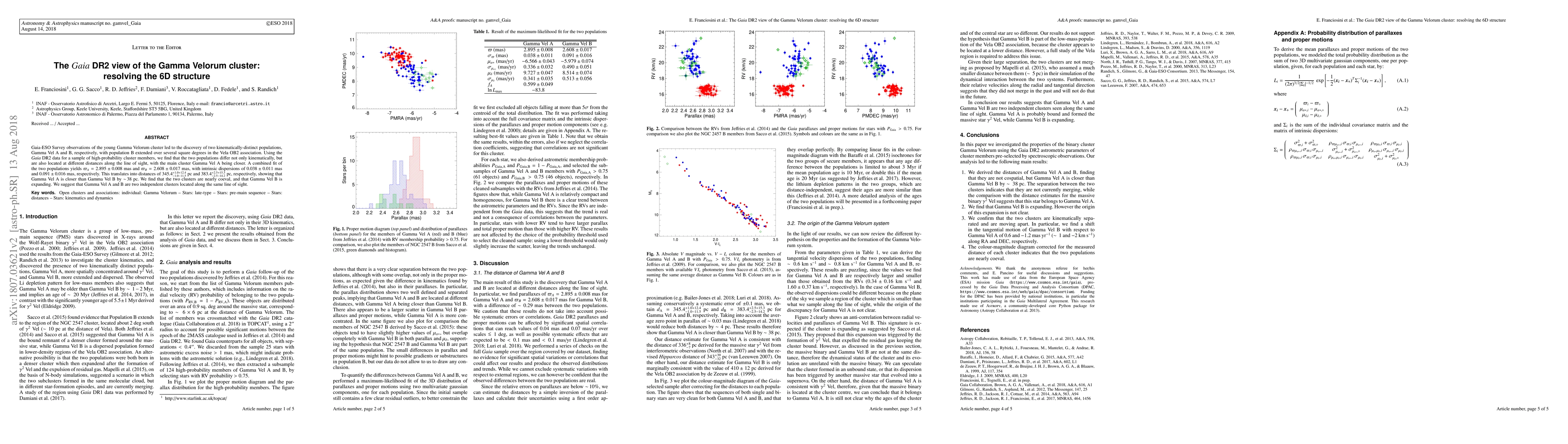 Gaia DR2 data reveals two distinct kinematic populations within the Gamma Velorum cluster, Gamma Vel A and B, with different distances along the line of sight, indicating Gamma Vel A is closer by approximately 38 pc. The two populations are nearly coeval, suggesting they are independent clusters along the same line of sight.