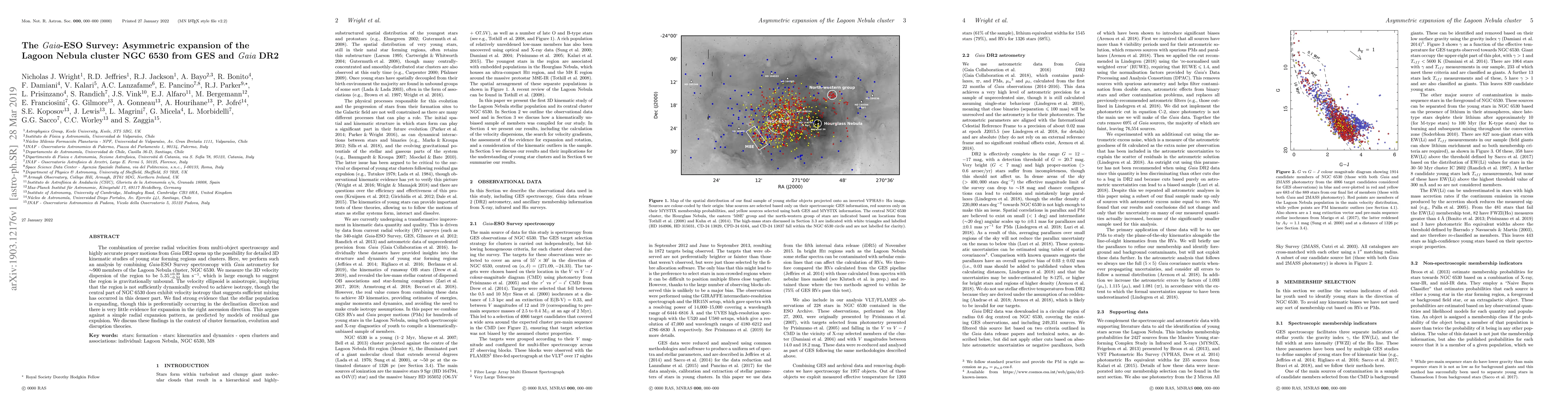 The Gaia-ESO Survey reveals that the Lagoon Nebula cluster NGC 6530 exhibits asymmetric expansion, with significant expansion in declination but minimal in right ascension, suggesting a complex formation and evolution process. The cluster's large 3D velocity dispersion indicates it may be gravitationally unbound.
