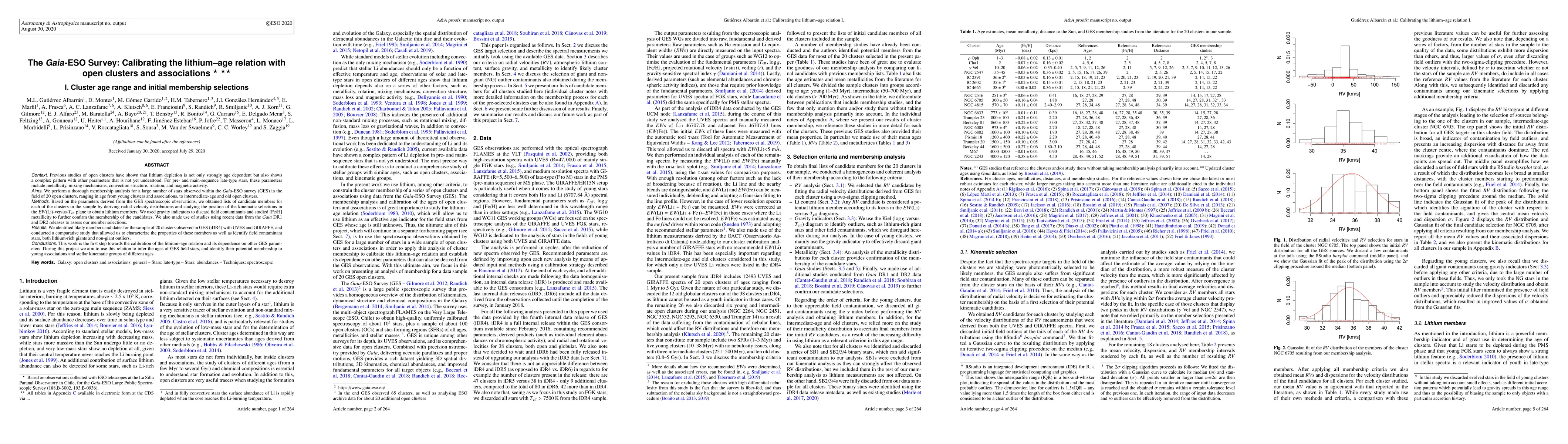 Previous studies of open clusters have shown that lithium depletion is not only strongly age dependent but also shows a complex pattern with other parameters that is not yet understood. For pre- and main-sequence late-type stars, these parameters include metallicity, mixing mechanisms, convection structure, rotation, and magnetic activity. We perform a thorough membership analysis for a large number of stars observed within the Gaia-ESO survey (GES) in the field of 20 open clusters, ranging in age from young clusters and associations, to intermediate-age and old open clusters. Based on the parameters derived from the GES spectroscopic observations, we obtained lists of candidate members for each of the clusters in the sample by deriving RV distributions and studying the position of the kinematic selections in the EW(Li) versus Teff plane to obtain lithium members. We used gravity indicators to discard field contaminants and studied [Fe/H] metallicity to further confirm the membership of the candidates. We also made use of studies using recent data from the Gaia DR1 and DR2 releases to assess our member selections. We identified likely member candidates for the sample of 20 clusters observed in GES (iDR4) with UVES and GIRAFFE, and conducted a comparative study that allowed us to characterize the properties of these members, as well as identify field contaminant stars, both lithium-rich giants and non-giant outliers. This work is the first step towards the calibration of the lithium-age relation and its dependence on other GES parameters. During this project we aim to use this relation to infer the ages of GES field stars, and identify their potential membership to young associations and stellar kinematic groups of different ages.