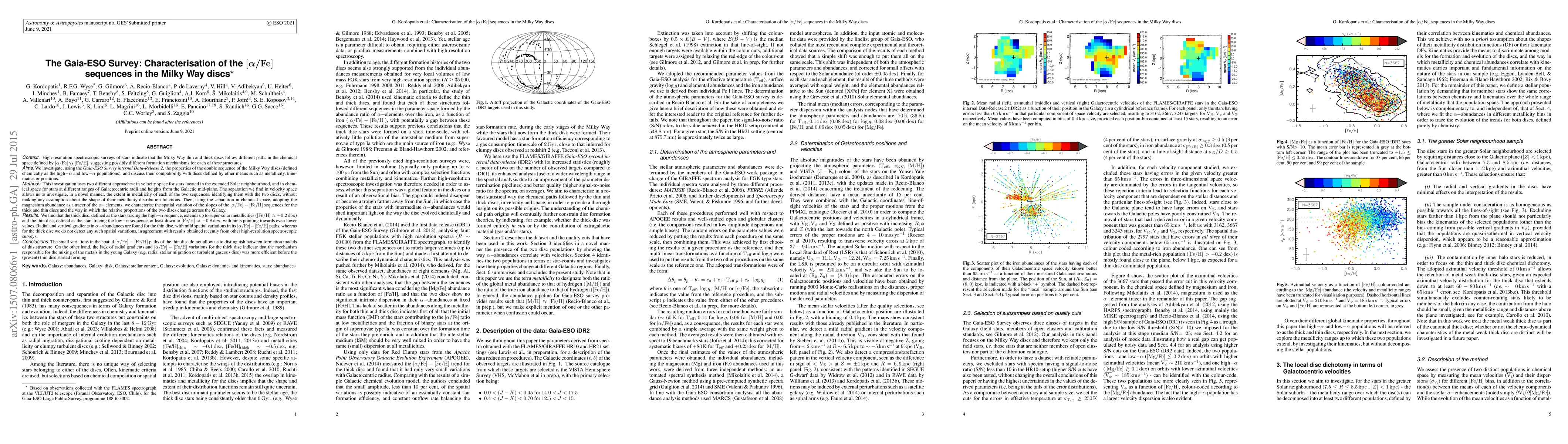 We investigate, using the Gaia-ESO Survey internal Data-Release 2, the properties of the double sequence of the Milky Way discs (defined chemically as the high-alpha and low-alpha populations), and discuss their compatibility with discs defined by other means such as metallicity, kinematics or positions. This investigation uses two different approaches: in velocity space for stars located in the extended Solar neighbourhood, and in chemical space for stars at different ranges of Galactocentric radii and heights from the plane. The separation we find in velocity space allows us to investigate, in a novel manner, the extent in metallicity of each of the two sequences, identifying them with the two discs, without making any assumption about the shape of their metallicity distribution functions. Then, using the separation in chemical space, we characterise the spatial variation of the slopes of the [alpha/Fe] - [Fe/H] sequences for the thick and thin discs and the way in which the relative proportions of the two discs change across the Galaxy. We find that the thick disc (high-alpha sequence), extends up to [Fe/H]~ +0.2 and the thin disc (low-alpha sequence), at least down to [Fe/H]~ -0.8. Radial and vertical gradients in alpha-abundances are found for the thin disc, with mild spatial variations in its [alpha/Fe] - [Fe/H] paths, whereas for the thick disc we do not detect any such spatial variations. The small variations in the spatial [alpha/Fe] - [Fe/H] paths of the thin disc do not allow us to distinguish between formation models of this structure. On the other hand, the lack of radial gradients and [alpha/Fe] - [Fe/H] variations for the thick disc indicate that the mechanism responsible for the mixing of the metals in the young Galaxy (e.g. radial stellar migration or turbulent gaseous disc) was more efficient before the (present) thin disc started forming.