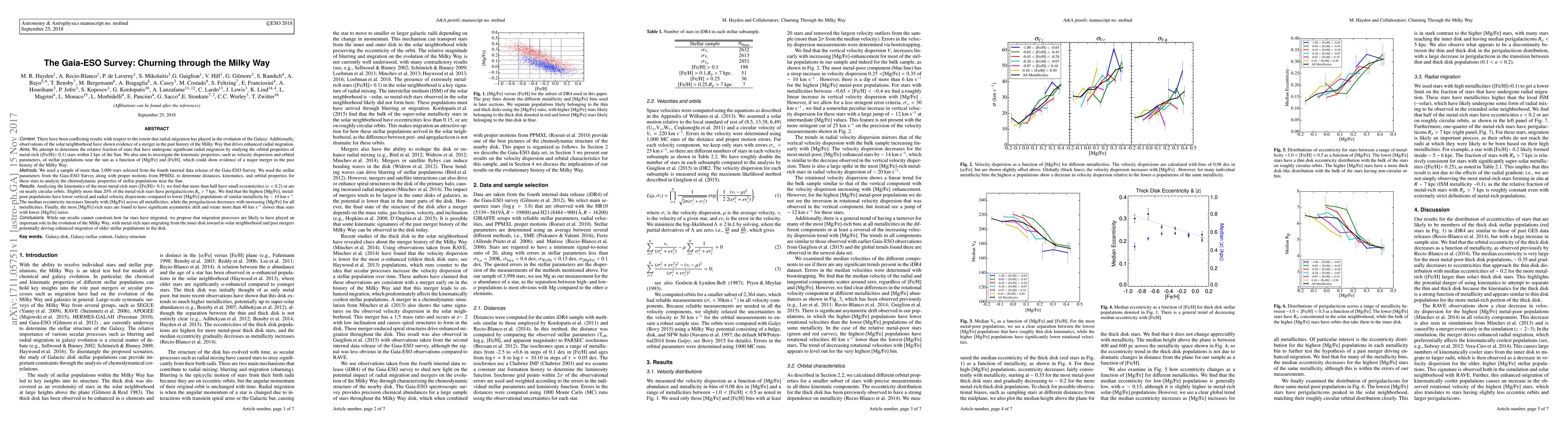 The Gaia-ESO Survey investigates the radial migration of metal-rich stars in the Milky Way, finding that over half have nearly circular orbits, suggesting significant migration. The study reveals that stars with higher [Mg/Fe] ratios exhibit lower velocity dispersions and rotate slower, indicating a complex evolutionary history involving past mergers.