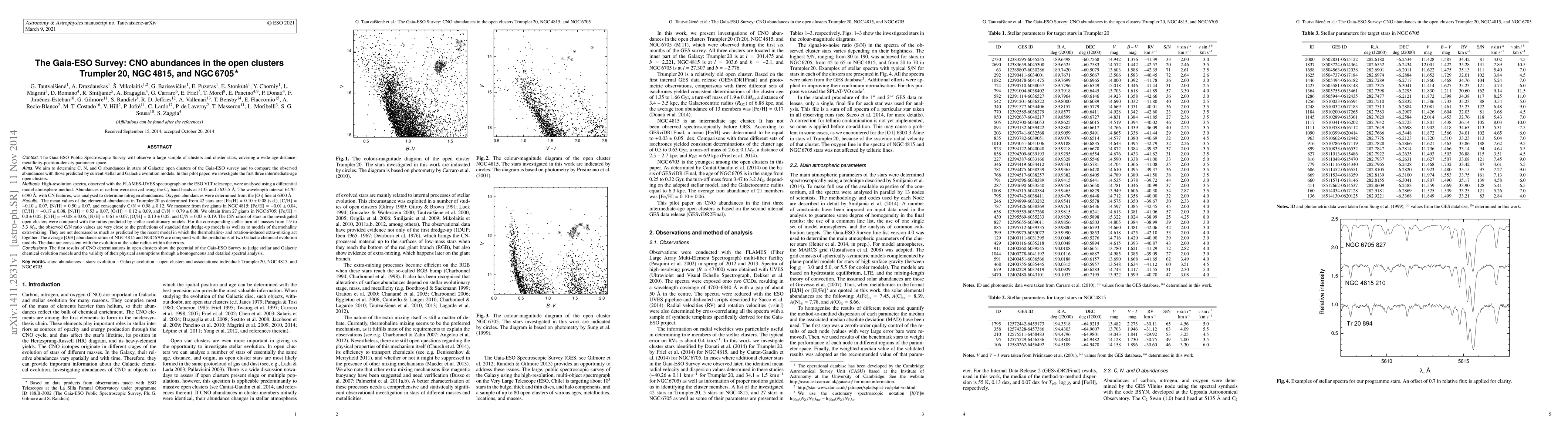This paper investigates C, N, and O abundances in stars of three open clusters (Trumpler 20, NGC 4815, and NGC 6705) using high-resolution spectra from the Gaia-ESO survey. The findings show that the C/N ratios align closely with predictions from stellar evolution models, supporting first dredge-up and thermohaline extra-mixing theories. Oxygen abundances are consistent with Galactic chemical evolution models.