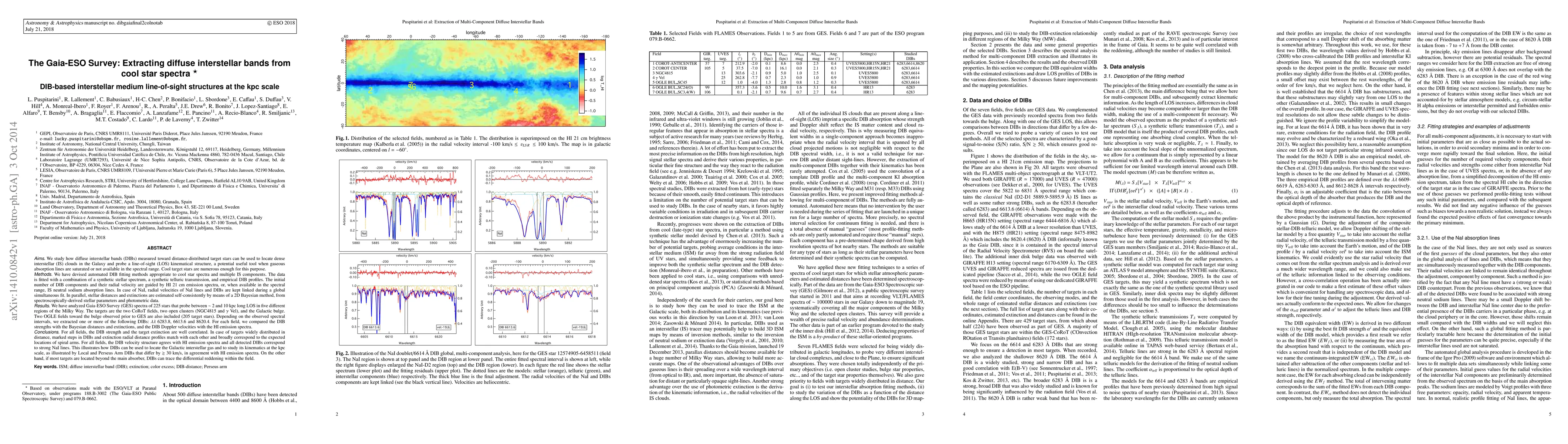This paper investigates the use of diffuse interstellar bands (DIBs) in cool star spectra to map dense interstellar clouds and study the Galactic interstellar medium's kinematic structure at kpc scales. The study employs automated DIB fitting methods and Bayesian distance estimations to analyze spectra from the Gaia-ESO Survey, revealing correlations between DIB strengths, extinction, and spiral arm locations.