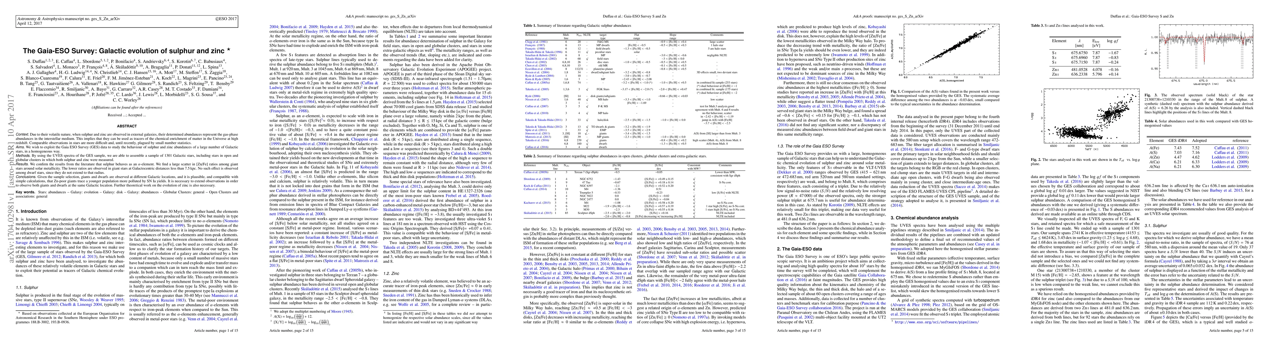 Due to their volatile nature, when sulfur and zinc are observed in external galaxies, their determined abundances represent the gas-phase abundances in the interstellar medium. This implies that they can be used as tracers of the chemical enrichment of matter in the Universe at high redshift. Comparable observations in stars are more difficult and, until recently, plagued by small number statistics. We wish to exploit the Gaia ESO Survey (GES) data to study the behaviour of sulfur and zinc abundances of a large number of Galactic stars, in a homogeneous way. By using the UVES spectra of the GES sample, we are able to assemble a sample of 1301 Galactic stars, including stars in open and globular clusters in which both sulfur and zinc were measured. We confirm the results from the literature that sulfur behaves as an alpha-element. We find a large scatter in [Zn/Fe] ratios among giant stars around solar metallicity. The lower ratios are observed in giant stars at Galactocentric distances less than 7.5 kpc. No such effect is observed among dwarf stars, since they do not extend to that radius. Given the sample selection, giants and dwarfs are observed at different Galactic locations, and it is plausible, and compatible with simple calculations, that Zn-poor giants trace a younger population more polluted by SN Ia yields. It is necessary to extend observations in order to observe both giants and dwarfs at the same Galactic location. Further theoretical work on the evolution of zinc is also necessary.