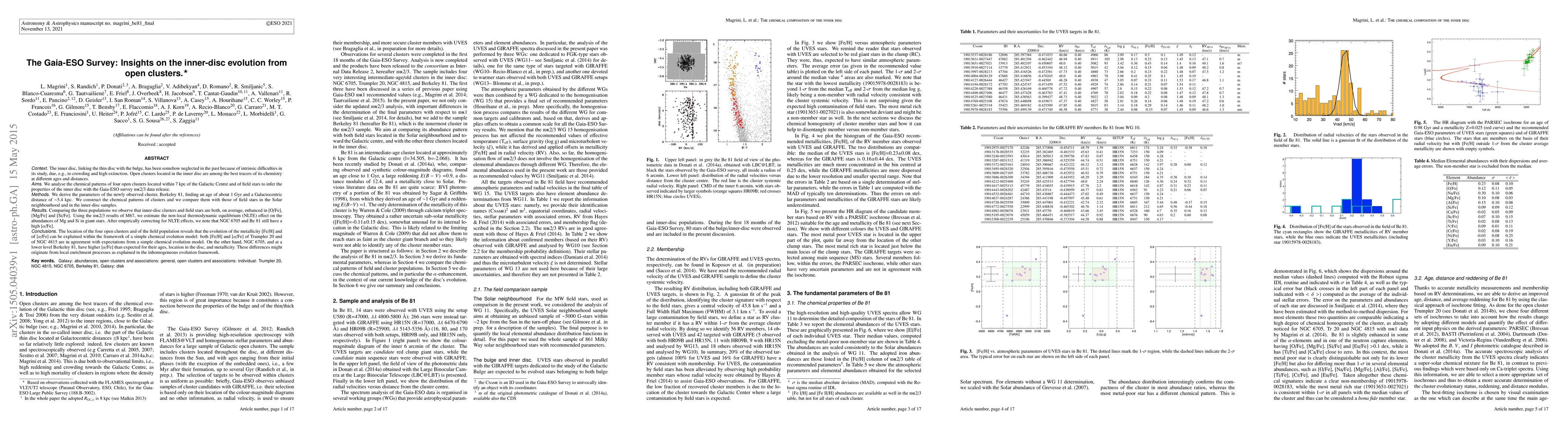 Context. The inner disc, linking the thin disc with the bulge, has been somehow neglected in the past because of intrinsic difficulties in its study, due, e.g., to crowding and high extinction. Open clusters located in the inner disc are among the best tracers of its chemistry at different ages and distances. Aims. We analyse the chemical patterns of four open clusters located within 7 kpc of the Galactic Centre and of field stars to infer the properties of the inner disc with the Gaia-ESO survey idr2/3 data release. Methods. We derive the parameters of the newly observed cluster, Berkeley 81, finding an age of about 1 Gyr and a Galactocentric distance of 5.4 kpc. We construct the chemical patterns of clusters and we compare them with those of field stars in the Solar neighbourhood and in the inner-disc samples. Results. Comparing the three populations we observe that inner-disc clusters and field stars are both, on average, enhanced in [O/Fe], [Mg/Fe] and [Si/Fe]. Using the idr2/3 results of M67, we estimate the non-local thermodynamic equilibrium (NLTE) effect on the abundances of Mg and Si in giant stars. After empirically correcting for NLTE effects, we note that NGC 6705 and Be 81 still have a high [{\alpha}/Fe]. Conclusions. The location of the four open clusters and of the field population reveals that the evolution of the metallicity [Fe/H] and of [alpha/Fe] can be explained within the framework of a simple chemical evolution model: both [Fe/H] and [{\alpha}/Fe] of Trumpler 20 and of NGC 4815 are in agreement with expectations from a simple chemical evolution model. On the other hand, NGC 6705, and at a lower level Berkeley 81, have higher [{\alpha}/Fe] than expected for their ages, location in the disc, and metallicity. These differences might originate from local enrichment processes as explained in the inhomogeneous evolution framework.