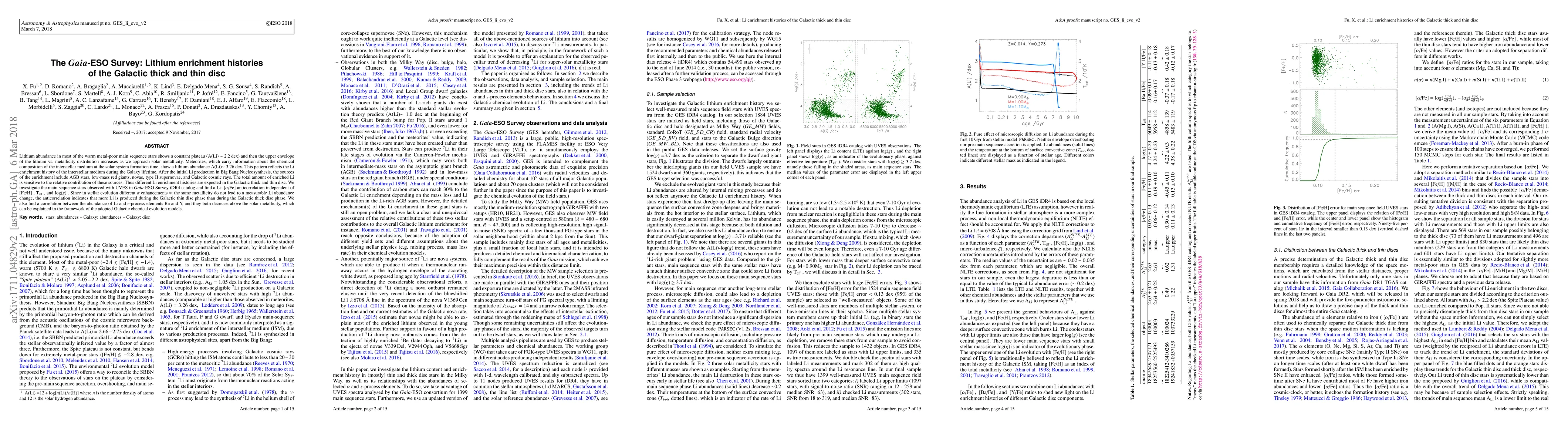 Lithium abundance in most of the warm metal-poor main sequence stars shows a constant plateau (A(Li)~2.2 dex) and then the upper envelope of the lithium vs. metallicity distribution increases as we approach solar metallicity. Meteorites, which carry information about the chemical composition of the interstellar medium at the solar system formation time, show a lithium abundance A(Li)~3.26 dex. This pattern reflects the Li enrichment history of the interstellar medium during the Galaxy lifetime. After the initial Li production in Big Bang Nucleosynthesis, the sources of the enrichment include AGB stars, low-mass red giants, novae, type II supernovae, and Galactic cosmic rays. The total amount of enriched Li is sensitive to the relative contribution of these sources. Thus different Li enrichment histories are expected in the Galactic thick and thin disc. We investigate the main sequence stars observed with UVES in Gaia-ESO Survey iDR4 catalog and find a Li-[alpha/Fe] anticorrelation independent of [Fe/H], Teff, and log(g). Since in stellar evolution different {\alpha} enhancements at the same metallicity do not lead to a measurable Li abundance change, the anticorrelation indicates that more Li is produced during the Galactic thin disc phase than during the Galactic thick disc phase. We also find a correlation between the abundance of Li and s-process elements Ba and Y, and they both decrease above the solar metallicity, which can be explained in the framework of the adopted Galactic chemical evolution models.