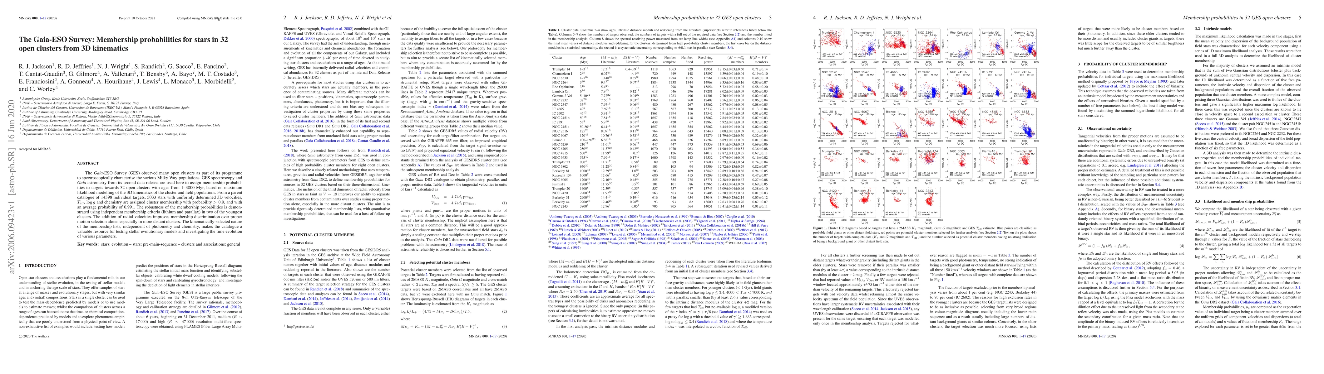 The Gaia-ESO Survey assigns membership probabilities to 5033 stars in 32 open clusters using GES spectroscopy and Gaia astrometry, focusing on 3D kinematics. The resulting catalogue, with an average membership probability of 0.991, provides a robust resource for testing stellar evolutionary models and studying the evolution of stellar parameters.