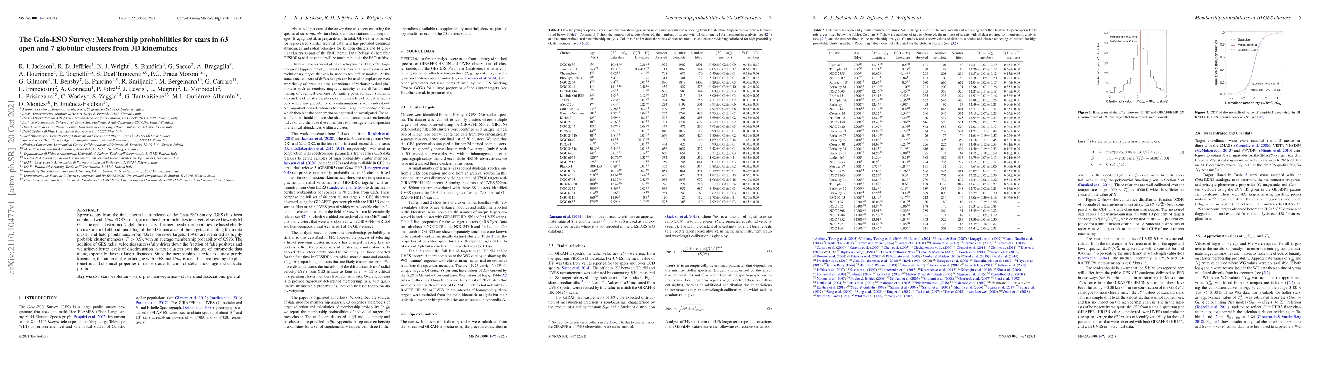 The Gaia-ESO Survey combines spectroscopy with Gaia EDR3 data to determine membership probabilities for stars in 63 open and 7 globular clusters, using 3D kinematics. The study identifies 13985 highly probable cluster members from 43211 targets, significantly reducing false positives with the addition of GES radial velocities.