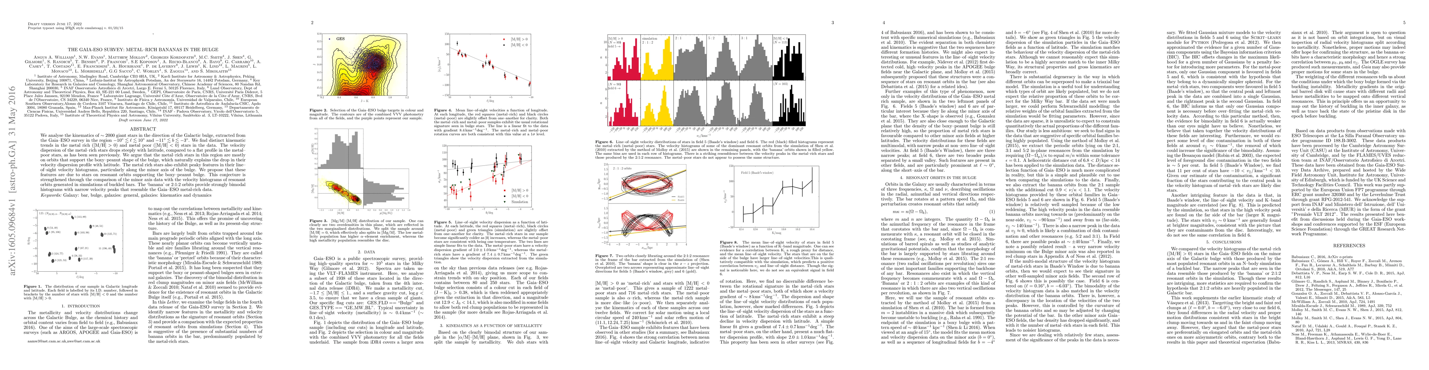 We analyse the kinematics of $\sim 2000$ giant stars in the direction of the Galactic bulge, extracted from the Gaia-ESO survey in the region $-10^\circ \lesssim \ell \lesssim 10^\circ$ and $-11^\circ \lesssim b \lesssim -3^\circ$. We find distinct kinematic trends in the metal rich ($\mathrm{[M/H]}>0$) and metal poor ($\mathrm{[M/H]}<0$) stars in the data. The velocity dispersion of the metal-rich stars drops steeply with latitude, compared to a flat profile in the metal-poor stars, as has been seen previously. We argue that the metal-rich stars in this region are mostly on orbits that support the boxy-peanut shape of the bulge, which naturally explains the drop in their velocity dispersion profile with latitude. The metal rich stars also exhibit peaky features in their line-of-sight velocity histograms, particularly along the minor axis of the bulge. We propose that these features are due to stars on resonant orbits supporting the boxy-peanut bulge. This conjecture is strengthened through the comparison of the minor axis data with the velocity histograms of resonant orbits generated in simulations of buckled bars. The 'banana' or 2:1:2 orbits provide strongly bimodal histograms with narrow velocity peaks that resemble the Gaia-ESO metal-rich data.