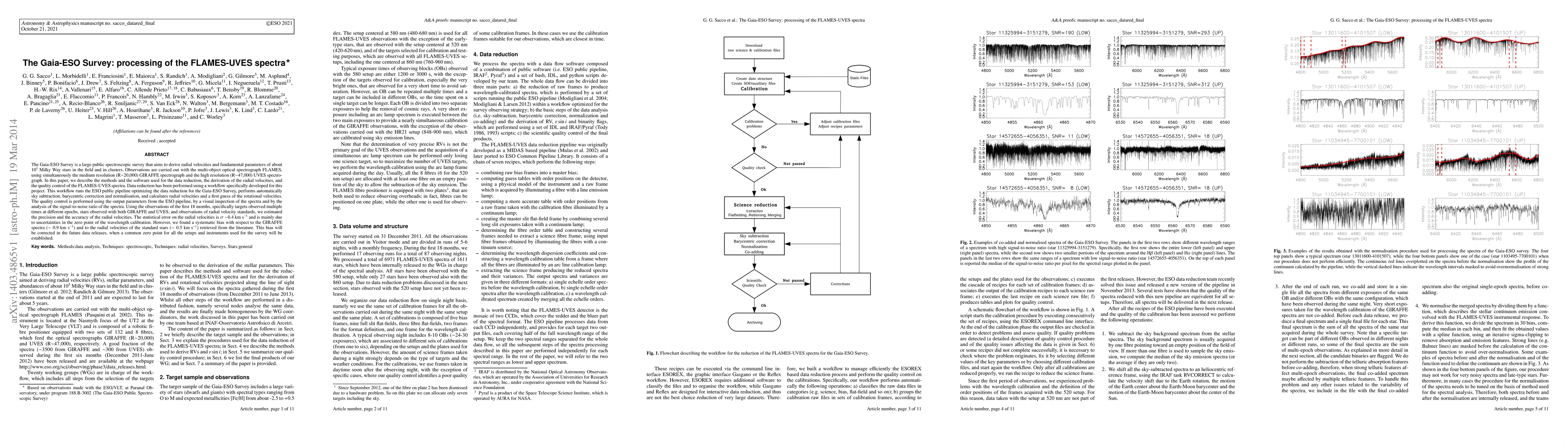 The Gaia-ESO Survey utilizes FLAMES-UVES spectra for deriving radial velocities and fundamental parameters of Milky Way stars. The data reduction workflow includes automated sky subtraction, barycentric correction, and radial velocity calculation, with quality control via visual inspection and signal-to-noise analysis. Initial radial velocity precision is 0.4 km s^-1, but systematic biases will be corrected in future data releases.