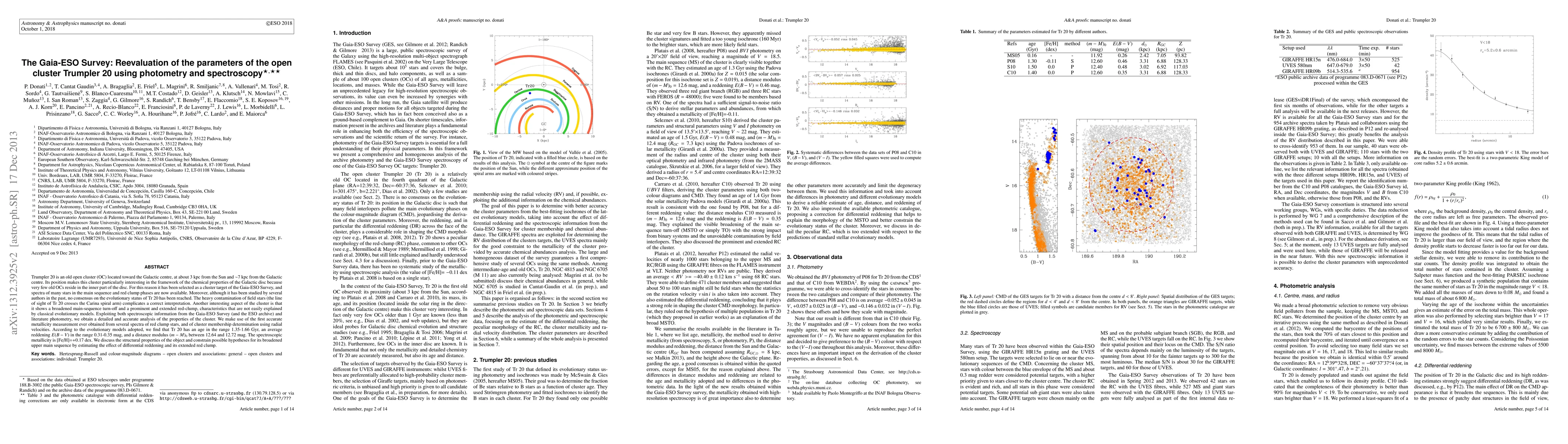 The Gaia-ESO Survey reevaluates the parameters of the old open cluster Trumpler 20, revealing an age range of 1.35-1.66 Gyr, average reddening of 0.31-0.35 mag, and a distance modulus of 12.64-12.72 mag, with a spectroscopic metallicity of [Fe/H]=+0.17 dex. The study addresses the cluster's broadened main-sequence and extended red clump, suggesting possible differential reddening effects.