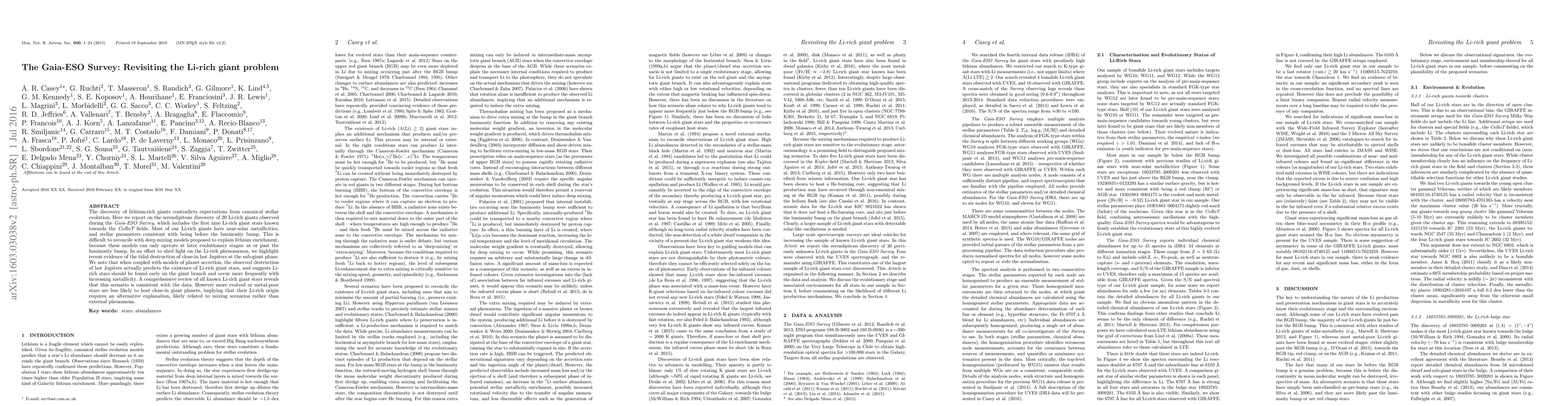 The Gaia-ESO Survey discovered 20 lithium-rich giant stars, challenging existing deep mixing models for lithium enrichment, which predict such stars should appear later in stellar evolution. The findings suggest that tidal destruction of hot Jupiters during the sub-giant phase, followed by accretion models, could explain the early appearance of Li-rich giants.