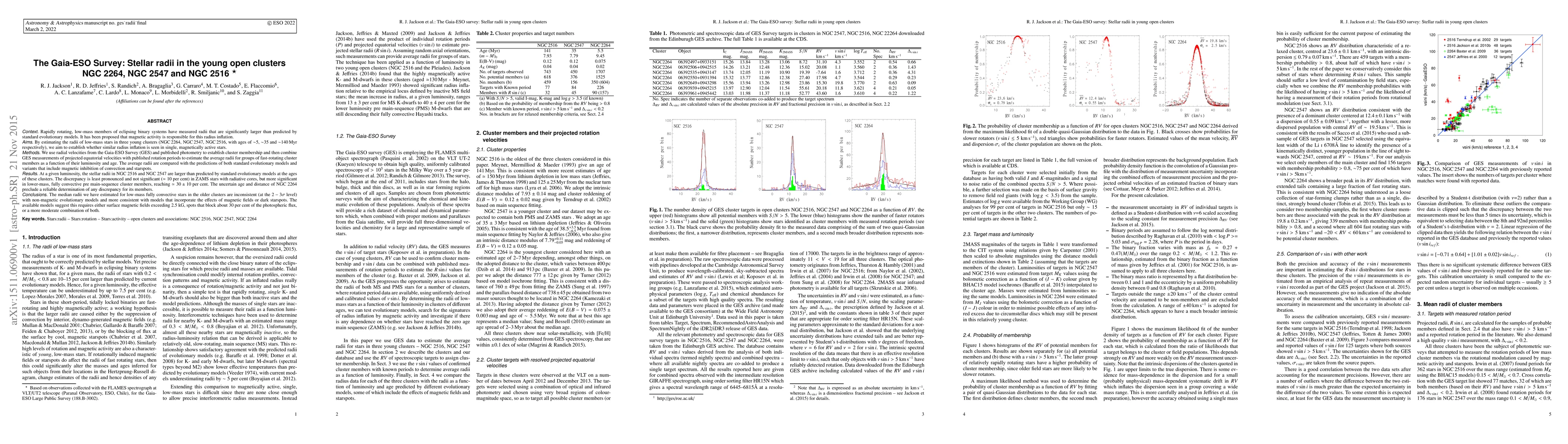 The Gaia-ESO Survey investigates stellar radii in young open clusters NGC 2264, NGC 2547, and NGC 2516, finding that low-mass stars exhibit radii larger than predicted by standard models, suggesting radius inflation due to magnetic activity. The study indicates that older clusters show a more significant discrepancy, supporting models that include magnetic inhibition of convection and starspots.