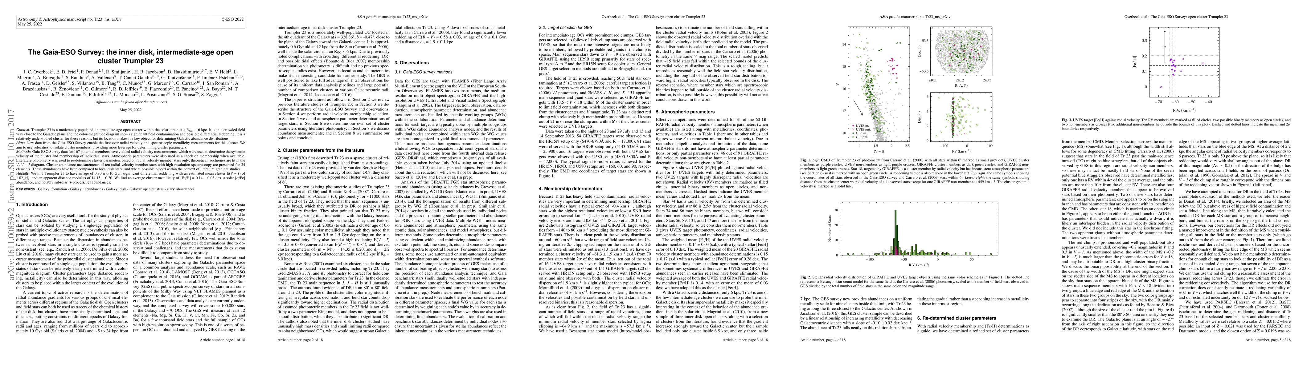 The Gaia-ESO Survey provides radial velocity and spectroscopic data for Trumpler 23, an intermediate-age open cluster, revealing its age, differential reddening, and metallicity, and highlighting its significance for understanding Galactic abundance distributions. The study finds an age of 0.80 Gyr, with an average cluster metallicity of [Fe/H] = 0.14 dex.