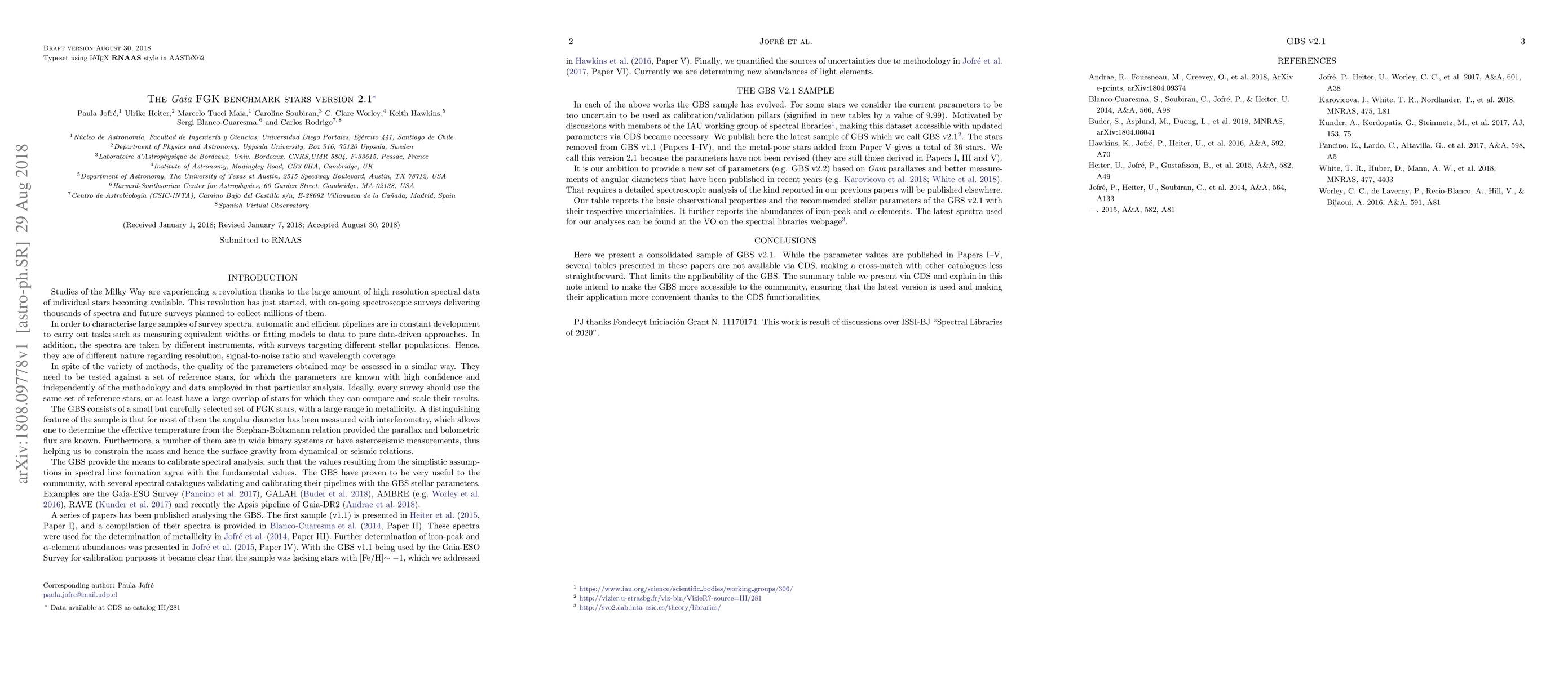 The Gaia FGK benchmark stars version 2.1 provides a carefully selected sample of reference stars for testing spectroscopic survey pipelines, with consistently derived parameters. This updated list is recommended for validation and calibration purposes, available at CDS as catalog III/281.