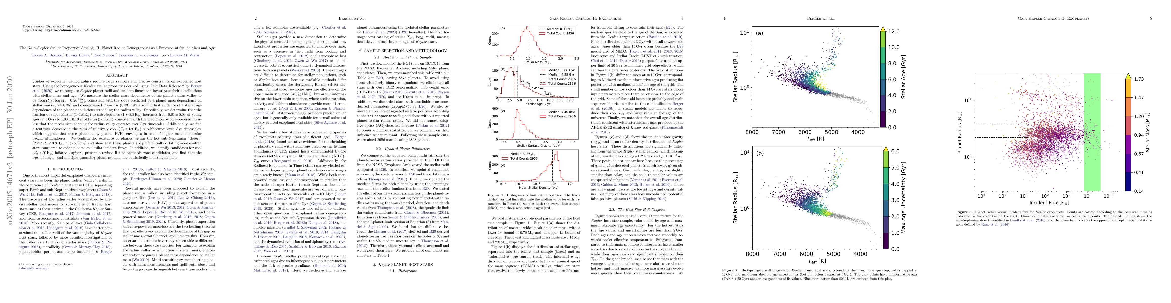 Studies of exoplanet demographics require large samples and precise constraints on exoplanet host stars. Using the homogeneous Kepler stellar properties derived using Gaia Data Release 2 by Berger et al. (2020), we re-compute Kepler planet radii and incident fluxes and investigate their distributions with stellar mass and age. We measure the stellar mass dependence of the planet radius valley to be $d \log R_{\mathrm{p}}$/$d \log M_\star = 0.26^{+0.21}_{-0.16}$, consistent with the slope predicted by a planet mass dependence on stellar mass ($0.24-0.35$) and core-powered mass-loss (0.33). We also find first evidence of a stellar age dependence of the planet populations straddling the radius valley. Specifically, we determine that the fraction of super-Earths ($1-1.8 \mathrm{R_\oplus}$) to sub-Neptunes ($1.8-3.5 \mathrm{R_\oplus}$) increases from $0.61 \pm 0.09$ at young ages (< 1 Gyr) to $1.00 \pm 0.10$ at old ages (> 1 Gyr), consistent with the prediction by core-powered mass-loss that the mechanism shaping the radius valley operates over Gyr timescales. Additionally, we find a tentative decrease in the radii of relatively cool ($F_{\mathrm{p}} < 150 \mathrm{F_\oplus}$) sub-Neptunes over Gyr timescales, which suggests that these planets may possess H/He envelopes instead of higher mean molecular weight atmospheres. We confirm the existence of planets within the hot sub-Neptunian "desert" ($2.2 < R_{\mathrm{p}} < 3.8 \mathrm{R_\oplus}$, $F_{\mathrm{p}} > 650 \mathrm{F_\oplus}$) and show that these planets are preferentially orbiting more evolved stars compared to other planets at similar incident fluxes. In addition, we identify candidates for cool ($F_{\mathrm{p}} < 20 \mathrm{F_\oplus}$) inflated Jupiters, present a revised list of habitable zone candidates, and find that the ages of single- and multiple-transiting planet systems are statistically indistinguishable.