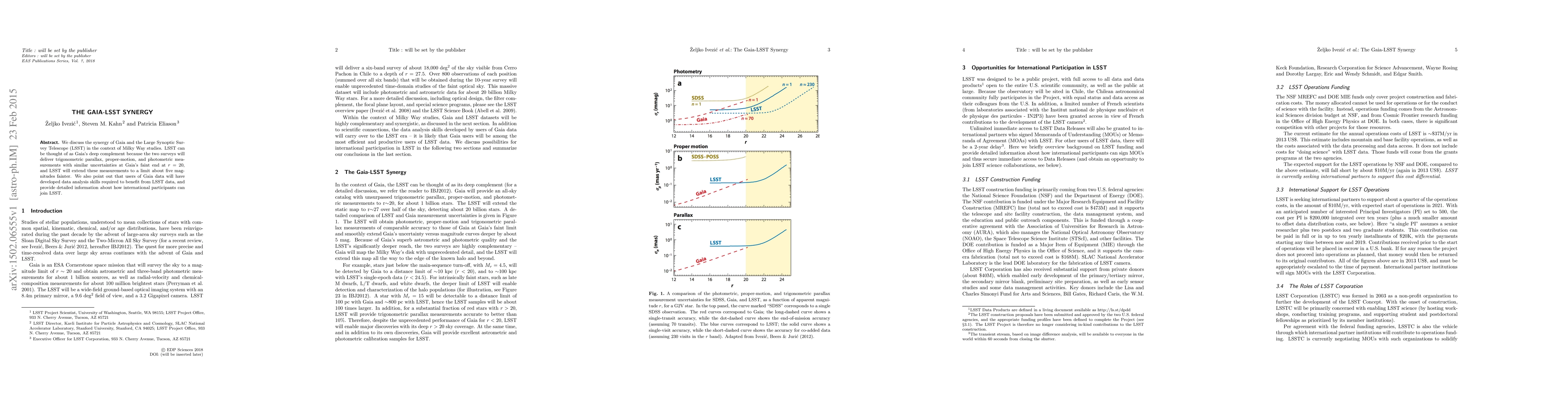The Gaia-LSST Synergy explores how the Large Synoptic Survey Telescope (LSST) complements Gaia's data, extending its reach five magnitudes fainter while both surveys provide similar precision in parallax, proper motion, and photometry at $r=20$. International collaboration is encouraged for maximizing the benefits of LSST data.