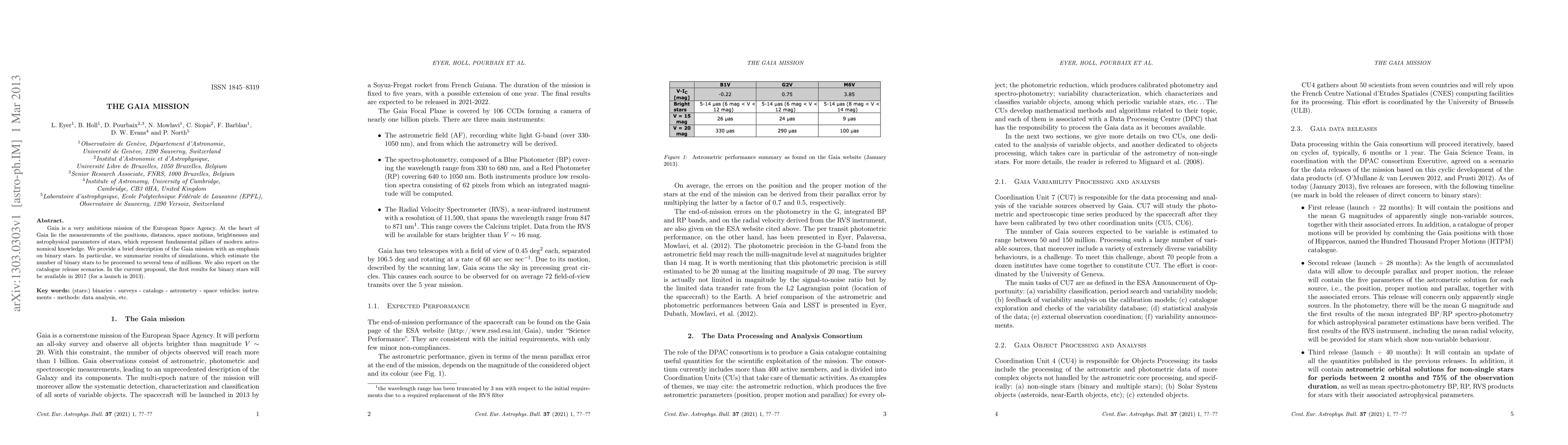 Gaia is an ambitious European Space Agency mission focused on measuring fundamental astronomical parameters of stars, including binary stars. Simulations estimate the mission will process tens of millions of binary stars, with initial results expected in 2017 following a 2013 launch.