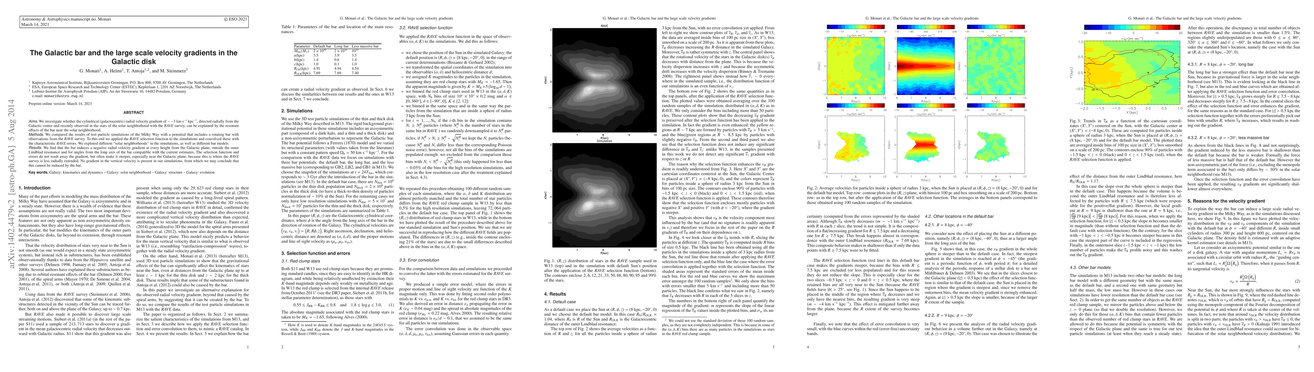 The paper presents detailed 3D test particle simulations of the Galactic disk, incorporating a bar potential and comparing the results with RAVE survey data after applying the RAVE selection function and error convolution.