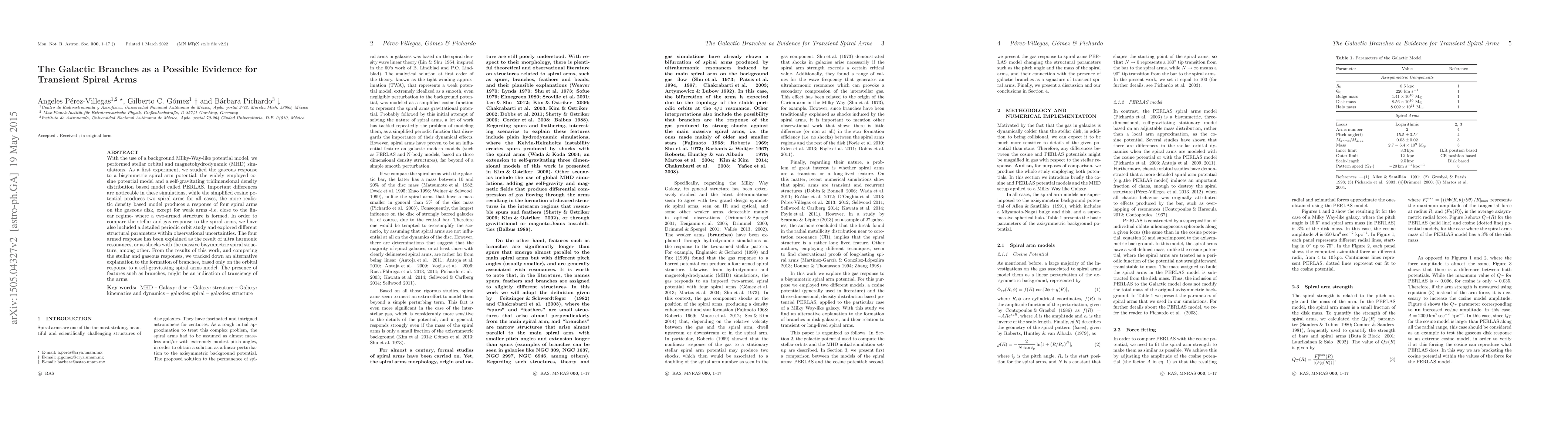 With the use of a background Milky-Way-like potential model, we performed stellar orbital and magnetohydrodynamic (MHD) simulations. As a first experiment, we studied the gaseous response to a bisymmetric spiral arm potential: the widely employed cosine potential model and a self-gravitating tridimensional density distribution based model called PERLAS. Important differences are noticeable in these simulations, while the simplified cosine potential produces two spiral arms for all cases, the more realistic density based model produces a response of four spiral arms on the gaseous disk, except for weak arms -i.e. close to the linear regime- where a two-armed structure is formed. In order to compare the stellar and gas response to the spiral arms, we have also included a detailed periodic orbit study and explored different structural parameters within observational uncertainties. The four armed response has been explained as the result of ultra harmonic resonances, or as shocks with the massive bisymmetric spiral structure, among other. From the results of this work, and comparing the stellar and gaseous responses, we tracked down an alternative explanation to the formation of branches, based only on the orbital response to a self-gravitating spiral arms model. The presence of features such as branches, might be an indication of transiency of the arms.