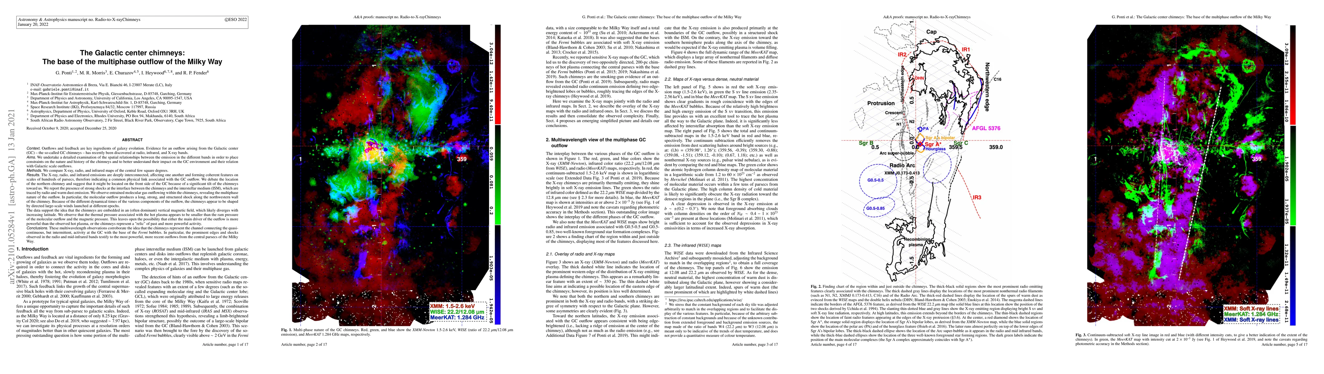 Outflows and feedback are key ingredients of galaxy evolution. Evidence for an outflow arising from the Galactic center (GC) has recently been discovered at different wavelength. We show that the X-ray, radio, and infrared emissions are deeply interconnected, affecting one another and forming coherent features on scales of hundreds of parsecs, therefore indicating a common physical link associated with the GC outflow. We debate the location of the northern chimney and suggest that it might be located on the front side of the GC because of a significant tilt of the chimneys toward us. We report the presence of strong shocks at the interface between the chimneys and the interstellar medium, which are traced by radio and warm dust emission. We observe entrained molecular gas outflowing within the chimneys, revealing the multiphase nature of the outflow. In particular, the molecular outflow produces a long, strong, and structured shock along the northwestern wall of the chimney. Because of the different dynamical times of the various components of the outflow, the chimneys appear to be shaped by directed large-scale winds launched at different epochs. The data support the idea that the chimneys are embedded in an (often dominant) vertical magnetic field, which likely diverges with increasing latitude. We observe that the thermal pressure associated with the hot plasma appears to be smaller than the ram pressure of the molecular outflow and the magnetic pressure. This leaves open the possibility that either the main driver of the outflow is more powerful than the observed hot plasma, or the chimneys represent a "relic" of past and more powerful activity. These multiwavelength observations corroborate the idea that the chimneys represent the channel connecting the quasi-continuous, but intermittent, activity at the GC with the base of the Fermi bubbles.