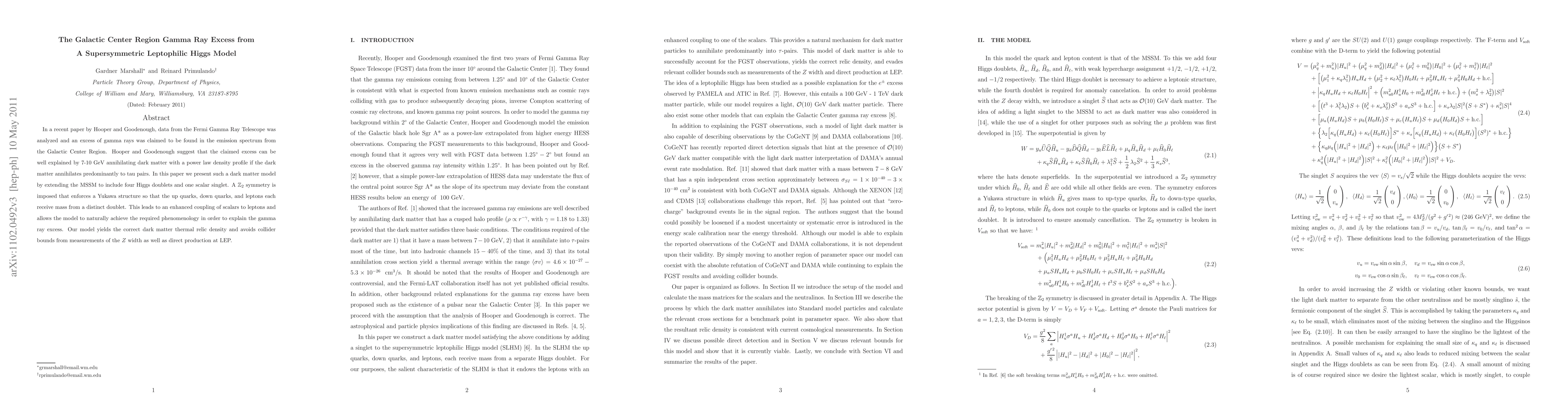 In a recent paper by Hooper and Goodenough, data from the Fermi Gamma Ray Telescope was analyzed and an excess of gamma rays was claimed to be found in the emission spectrum from the Galactic Center Region. Hooper and Goodenough suggest that the claimed excess can be well explained by 7-10 GeV annihilating dark matter with a power law density profile if the dark matter annihilates predominantly to tau pairs. In this paper we present such a dark matter model by extending the MSSM to include four Higgs doublets and one scalar singlet. A Z2 symmetry is imposed that enforces a Yukawa structure so that the up quarks, down quarks, and leptons each receive mass from a distinct doublet. This leads to an enhanced coupling of scalars to leptons and allows the model to naturally achieve the required phenomenology in order to explain the gamma ray excess. Our model yields the correct dark matter thermal relic density and avoids collider bounds from measurements of the Z width as well as direct production at LEP.