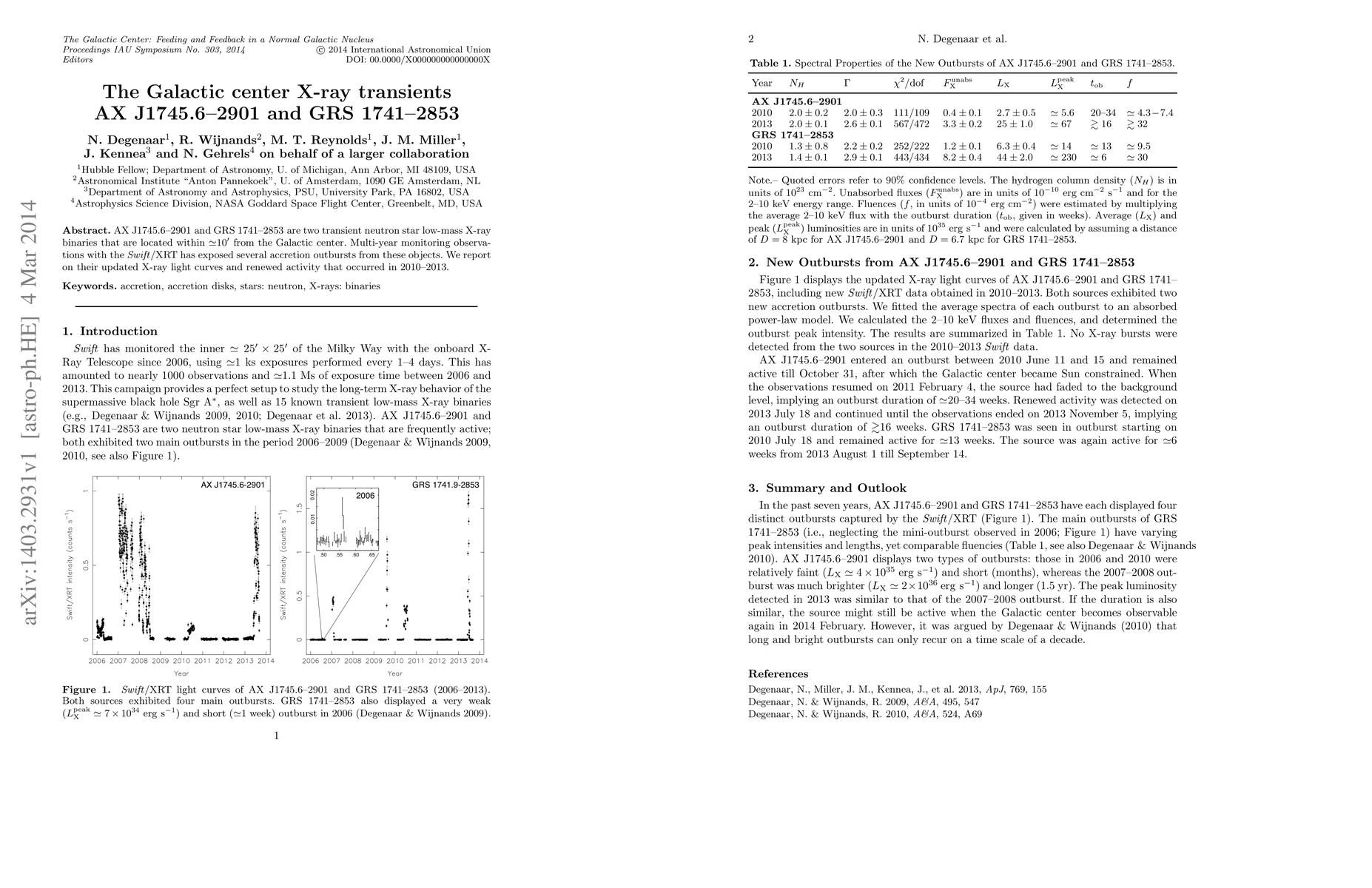 AX J1745.6-2901 and GRS 1741-2853 are two transient neutron star low-mass X-ray binaries that are located within ~10' from the Galactic center. Multi-year monitoring observations with the Swift/XRT has exposed several accretion outbursts from these objects. We report on their updated X-ray light curves and renewed activity that occurred in 2010-2013.