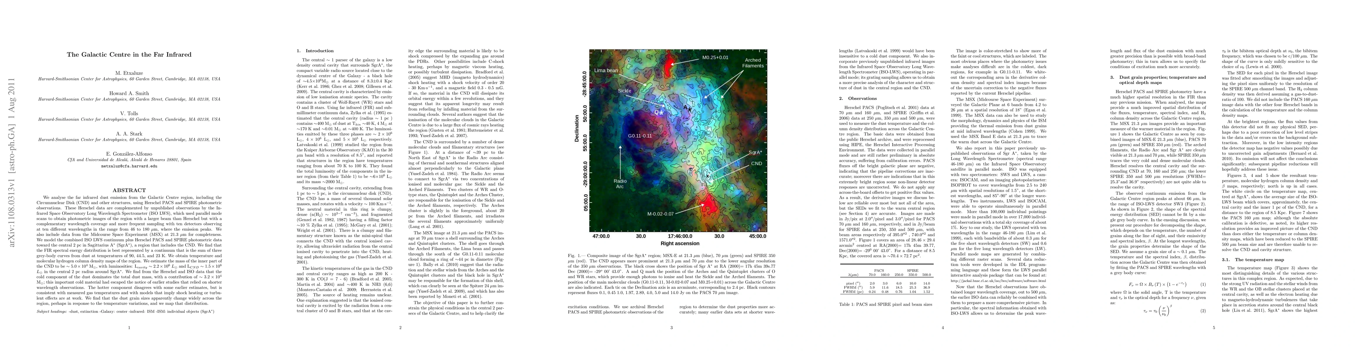We analyse the far infrared dust emission from the Galactic Centre region, including the Circumnuclear Disk (CND) and other structures, using Herschel PACS and SPIRE photometric observations. These Herschel data are complemented by unpublished observations by the Infrared Space Observatory Long Wavelength Spectrometer (ISO LWS), which used parallel mode scans to obtain photometric images of the region with a larger beam than Herschel but with a complementary wavelength coverage and more frequent sampling with ten detectors observing at ten different wavelengths in the range from 46 to 180 \mum, where the emission peaks. We also include data from the MSX at 21.3 \mum for completeness. We model the combined ISO LWS continuum plus Herschel PACS and SPIRE photometric data toward the central 2 pc in Sgr A*, a region that includes the CND. We find that the FIR spectral energy distribution is best represented by a continuum that is the sum of three greybody curves from dust at temperatures of 90, 44.5, and 23 K. We obtain temperature and molecular hydrogen column density maps of the region. We estimate the mass of the inner part of the CND to be ~5.0x10e+4 Msum, with luminosities: Lcavity ~2.2x10e+6 Lsun and Lcnd ~1.5x10e+6 Lsun in the central 2 pc radius around SgrA* . We find from the Herschel and ISO data that the cold component of the dust dominates the total dust mass, with a contribution of ~3.2x10E+4 Msun; this important cold material had escaped the notice of earlier studies that relied on shorter wavelength observations. The hotter component disagrees with some earlier estimates, but is consistent with measured gas temperatures and with models that imply shock heating or turbulent effects are at work. We find that the dust grain sizes apparently change widely across the region, perhaps in response to the temperature variations, and we map that distribution.