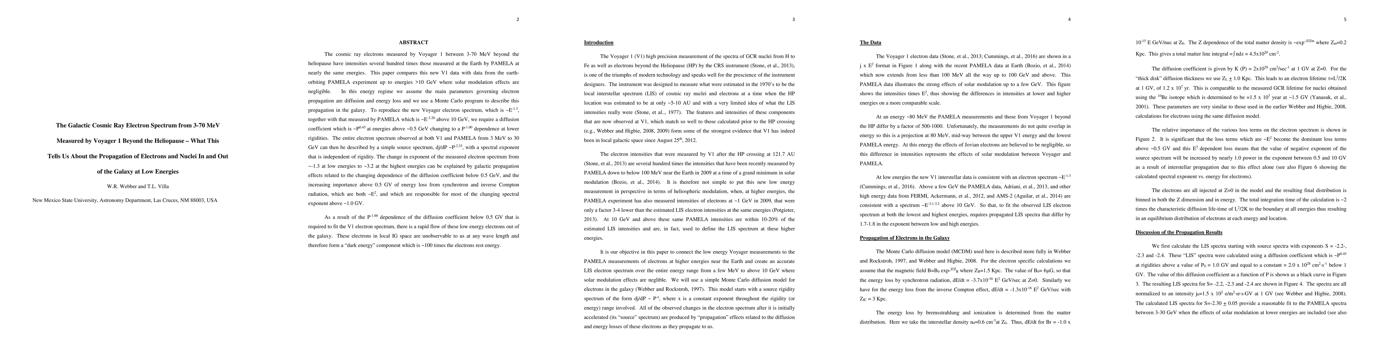 This paper measures cosmic ray electron spectra from 3 to 70 MeV beyond the heliopause using Voyager 1, revealing intensities much higher than those observed at Earth by PAMELA. The study uses a Monte Carlo model to describe electron propagation, finding a diffusion coefficient that changes with energy, explaining the observed spectrum and indicating a rapid outflow of low-energy electrons from the galaxy, forming a dark energy component.