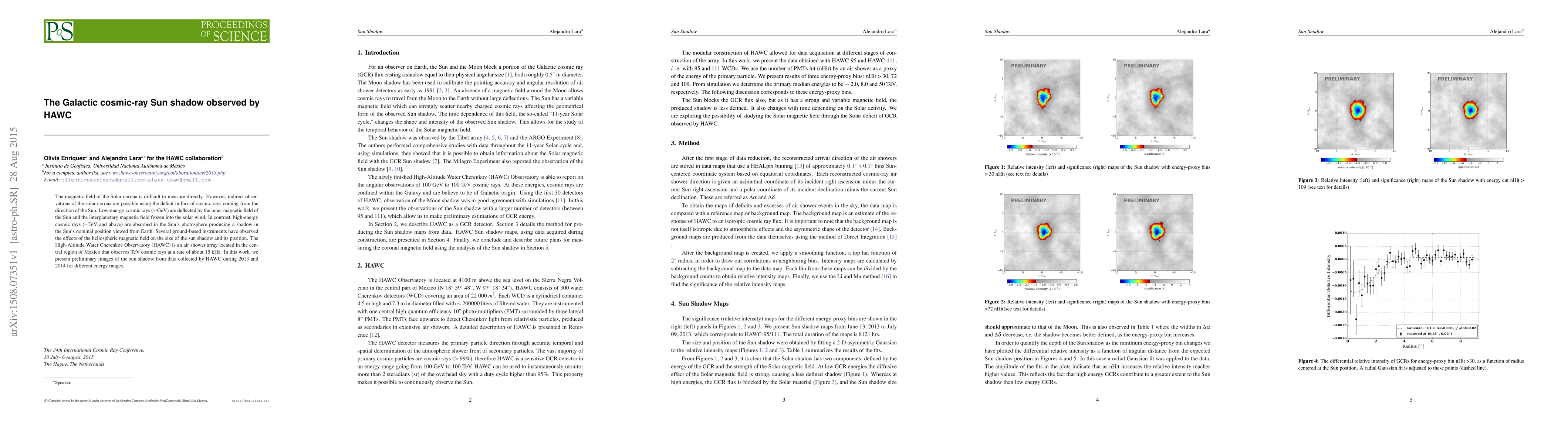 The magnetic field of the Solar corona is difficult to measure directly. However, indirect observations of the solar corona are possible using the deficit in flux of cosmic rays coming from the direction of the Sun. Low-energy cosmic rays (~GeV) are deflected by the inner magnetic field of the Sun and the interplanetary magnetic field frozen into the solar wind. In contrast, high-energy cosmic rays (~TeV and above) are absorbed in the Sun's photosphere producing a shadow in the Sun's nominal position viewed from Earth. Several ground-based instruments have observed the effects of the heliospheric magnetic field on the size of the sun shadow and its position. The High-Altitude Water Cherenkov Observatory (HAWC) is an air shower array located in the central region of Mexico that observes TeV cosmic rays at a rate of about 15 kHz. in this work, we present preliminary images of the sun shadow from data collected by HAWC during 2013 and 2014 for different energy ranges.