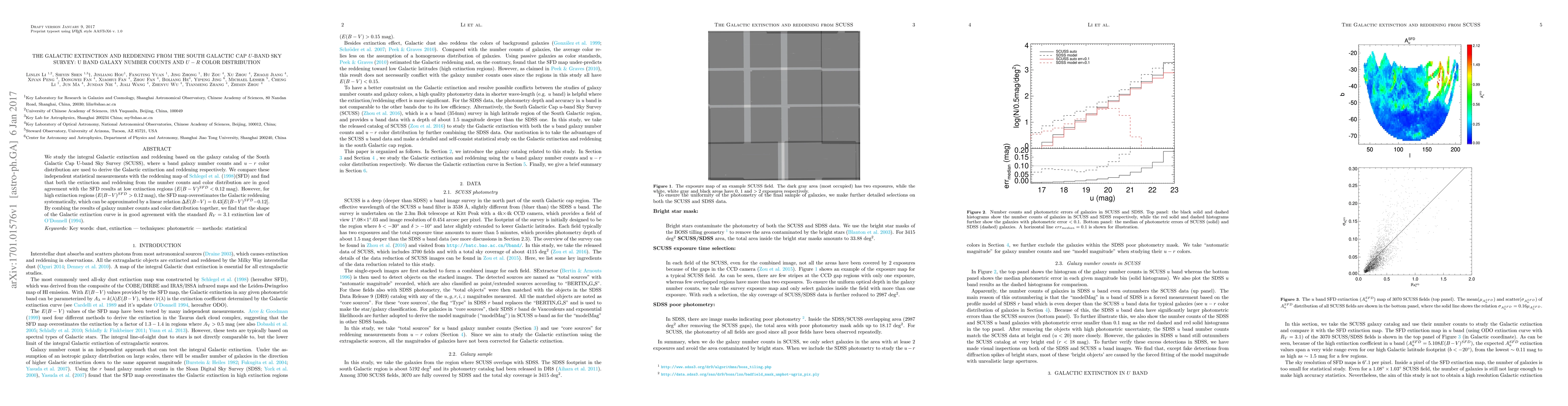 This study uses the South Galactic Cap U-band Sky Survey (SCUSS) to derive Galactic extinction and reddening, finding good agreement with the SFD map at low extinction regions. For high extinction regions, the SFD map overestimates reddening, with a systematic correction given by $\Delta E(B-V) = 0.43[E(B-V)^{SFD}-0.12]$, and the extinction curve aligns with the standard $R_V=3.1$ law.