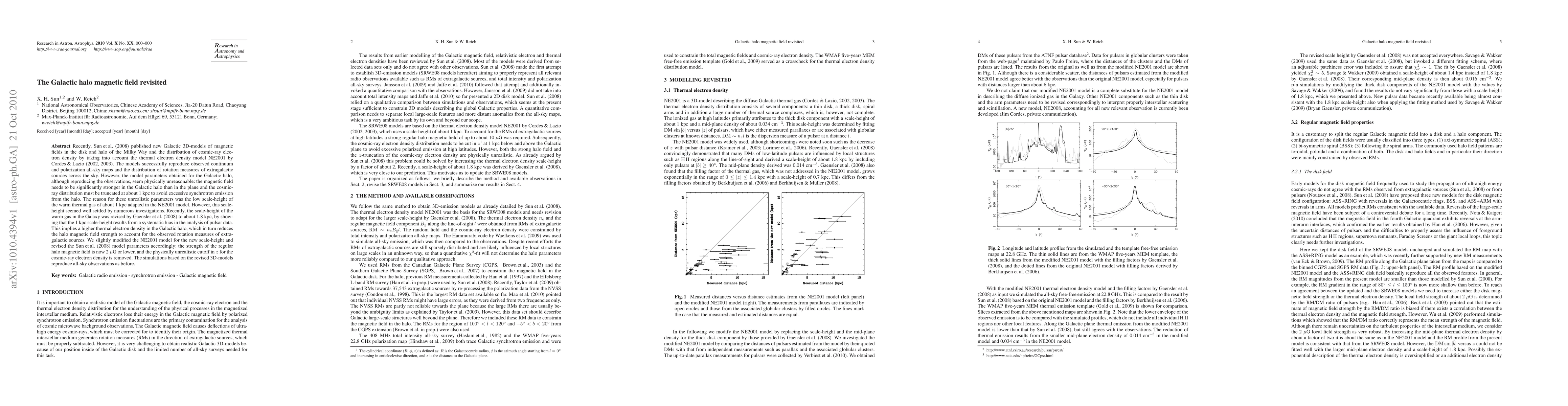 Sun et al. (2008) revised Galactic magnetic field models, finding unrealistic parameters for the halo. A new scale-height for warm gas by Gaensler et al. (2008) led to a revised model with a lower magnetic field strength of 2 microG or less and no cutoff for cosmic-ray electron density, while still matching observations.