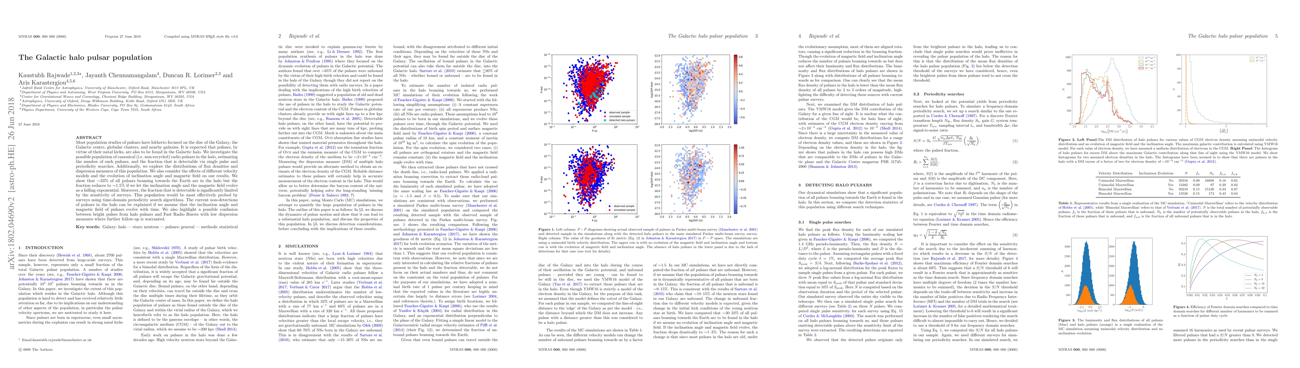 This study investigates the Galactic halo pulsar population, estimating that about 33% of pulsars beaming towards Earth are in the halo, but this fraction drops to 1.5% with evolution of inclination angle and magnetic field. Detection is limited by survey sensitivity, suggesting time-domain periodicity search algorithms for better probing. The paper also explores potential confusion between halo pulsar signals and Fast Radio Bursts.