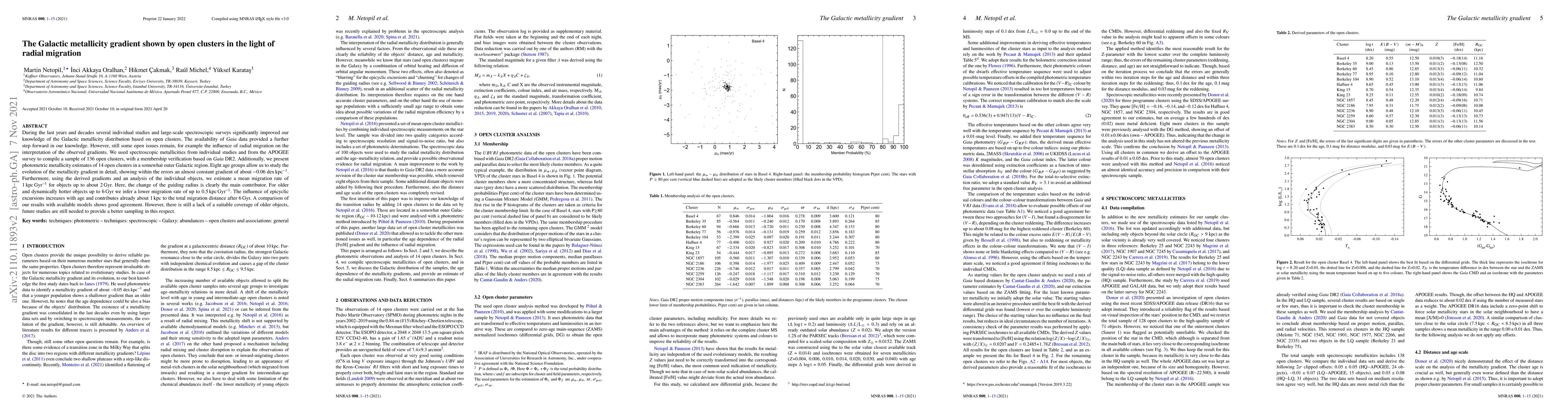 This paper investigates the Galactic metallicity gradient using open clusters, revealing an almost constant gradient of about -0.06 dex kpc$^{-1}$ across eight age groups. The study also estimates radial migration rates, finding a mean rate of 1 kpc Gyr$^{-1}$ up to 2 Gyr, decreasing to 0.5 kpc Gyr$^{-1}$ for older clusters, with epicyclic excursions playing a larger role in migration for older objects.