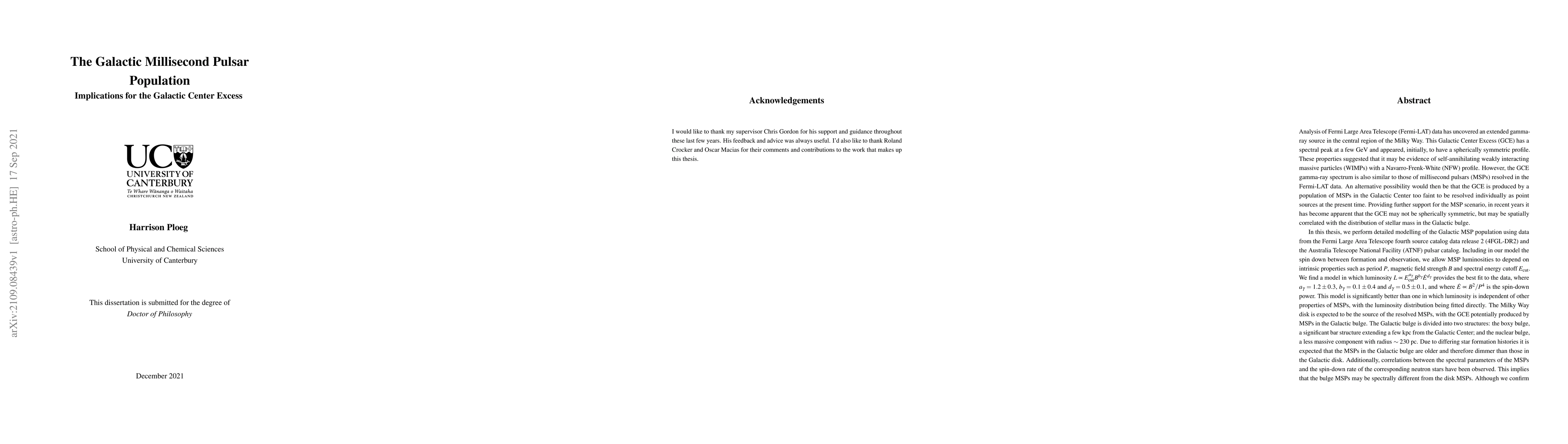 The Galactic Center Excess (GCE) is an extended gamma-ray source in the central region of the Galaxy found in Fermi Large Area Telescope data. In recent years it has become apparent that the GCE may not be spherically symmetric, but may be spatially correlated with the distribution of stellar mass in the Galactic bulge, potentially favoring an unresolved population of millisecond pulsars (MSPs) scenario. In this thesis, we perform detailed modelling of the Galactic MSP population. Including in our model the spin down between formation and observation, we find a model in which luminosity $L \propto E_{\rm cut}^{1.2 \pm 0.3} B^{0.1 \pm 0.4} \dot{E}^{0.5 \pm 0.1}$ provides the best fit to the data, where $E_{\rm cut}$ is spectral energy cutoff, $B$ is magnetic field strength, and $\dot{E}$ is the spin-down power. Due to differing star formation histories it is expected that the MSPs in the Galactic bulge are older and therefore dimmer than those in the Galactic disk. Our results demonstrate that we do not require that there is anything systematically different about the inner Galaxy MSPs to explain the GCE. In the "recycling" channel of MSP formation the neutron star forms from a core collapse supernovae that undergoes a random "kick" due to the asymmetry of the explosion. This would imply a smoothing out of the spatial distribution of the MSPs. We use N-body simulations to model how the MSP spatial distribution changes. We estimate the probability distribution of natal kick velocities using the resolved gamma-ray MSP proper motions, where MSPs have velocities relative to circular motion of 77 +/- 6 km/s, as determined as part of our Galactic MSP population model. We find that, due to the natal kicks, there is an approximately 10% increase in each of the bulge MSP spatial distribution dimensions and also the bulge MSP distribution becomes less boxy but is still far from being spherical.