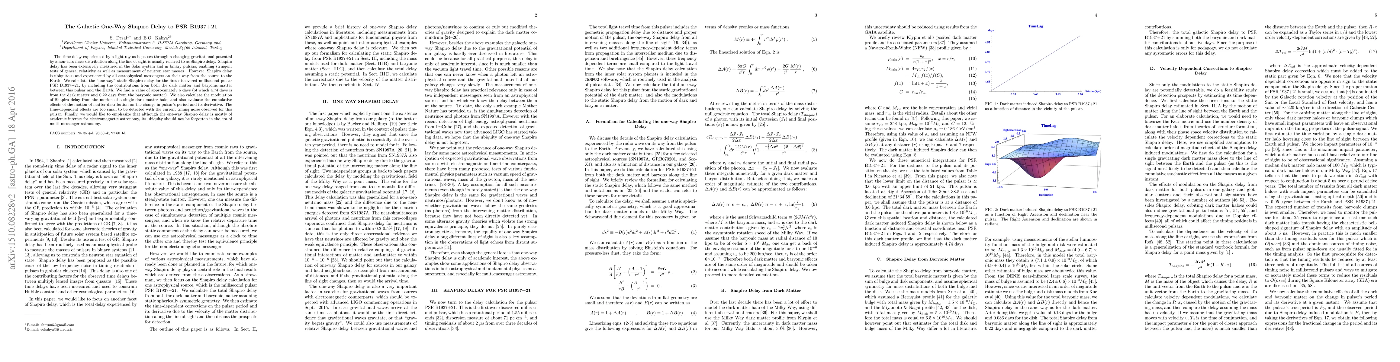 This paper calculates the "one-way" static Shapiro delay for the millisecond pulsar PSR B1937+21, attributing approximately 5 days to the delay, with 4.74 days from dark matter and 0.22 days from baryonic matter. It also discusses the negligible time-dependent effects on the pulsar's period and emphasizes the importance of Shapiro delay in multi-messenger astronomy.