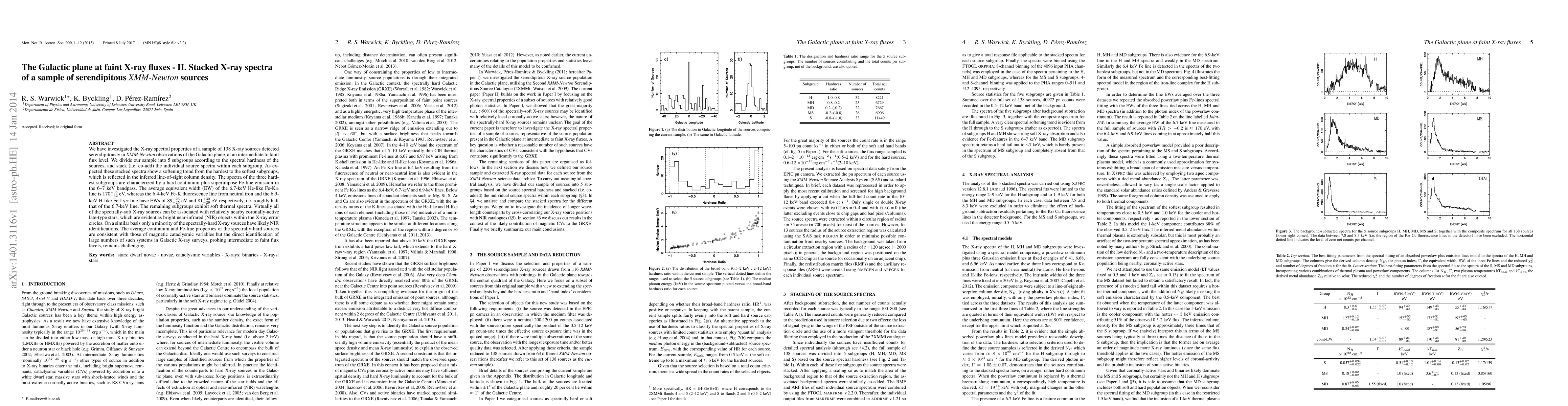 We have investigated the X-ray spectral properties of a sample of 138 X-ray sources detected serendipitously in $XMM-Newton$ observations of the Galactic plane, at an intermediate to faint flux level. We divide our sample into 5 subgroups according to the spectral hardness of the sources, and stack (i.e. co-add) the individual source spectra within each subgroup. As expected these stacked spectra show a softening trend from the hardest to the softest subgroups, which is reflected in the inferred line-of-sight column density. The spectra of the three hardest subgroups are characterized by a hard continuum plus superimpose Fe-line emission in the 6--7 keV bandpass. The average equivalent width (EW) of the 6.7-keV He-like Fe-K$\alpha$ line is 170$^{+35}_{-32}$ eV, whereas the 6.4-keV Fe-K fluorescence line from neutral iron and the 6.9-keV H-like Fe-Ly$\alpha$ line have EWs of 89$^{+26}_{-25}$ eV and 81$^{+30}_{-29}$ eV respectively, i.e. roughly half that of the 6.7-keV line. The remaining subgroups exhibit soft thermal spectra. Virtually all of the spectrally-soft X-ray sources can be associated with relatively nearby coronally-active late-type stars, which are evident as bright near-infrared (NIR) objects within the X-ray error circles. On a similar basis only a minority of the spectrally-hard X-ray sources have likely NIR identifications. The average continuum and Fe-line properties of the spectrally-hard sources are consistent with those of magnetic cataclysmic variables but the direct identification of large numbers of such systems in Galactic X-ray surveys, probing intermediate to faint flux levels, remains challenging.