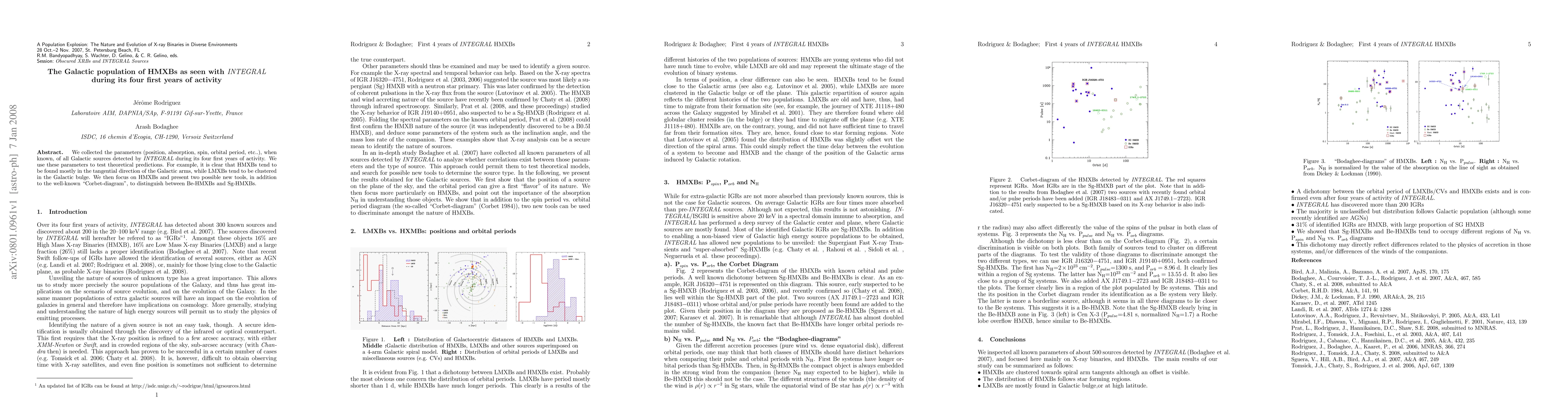 Summary: This study compiles data from Galactic High-Mass X-ray Binaries (HMXBs) detected by INTEGRAL over its first four years, revealing their distribution relative to Galactic arms and bulge, and introduces new tools for distinguishing between Be-HMXBs and Sg-HMXBs.