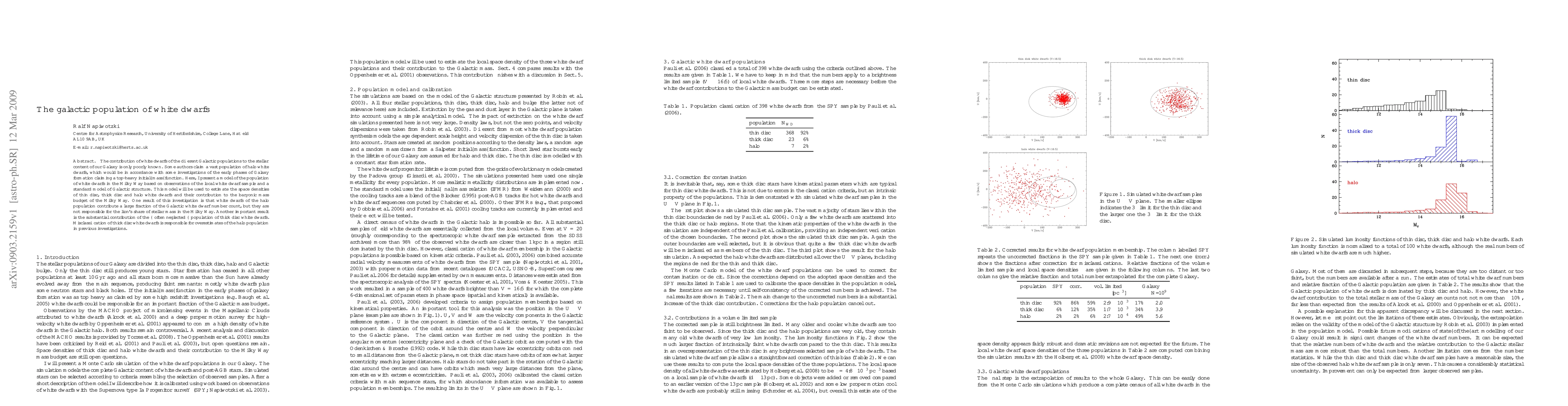 This paper models the Milky Way's white dwarf population, finding that halo white dwarfs are numerous but not the main mass contributors, while thick disc white dwarfs significantly contribute to the stellar mass budget. Misclassification of thick disc white dwarfs has led to previous overestimates of the halo population.
