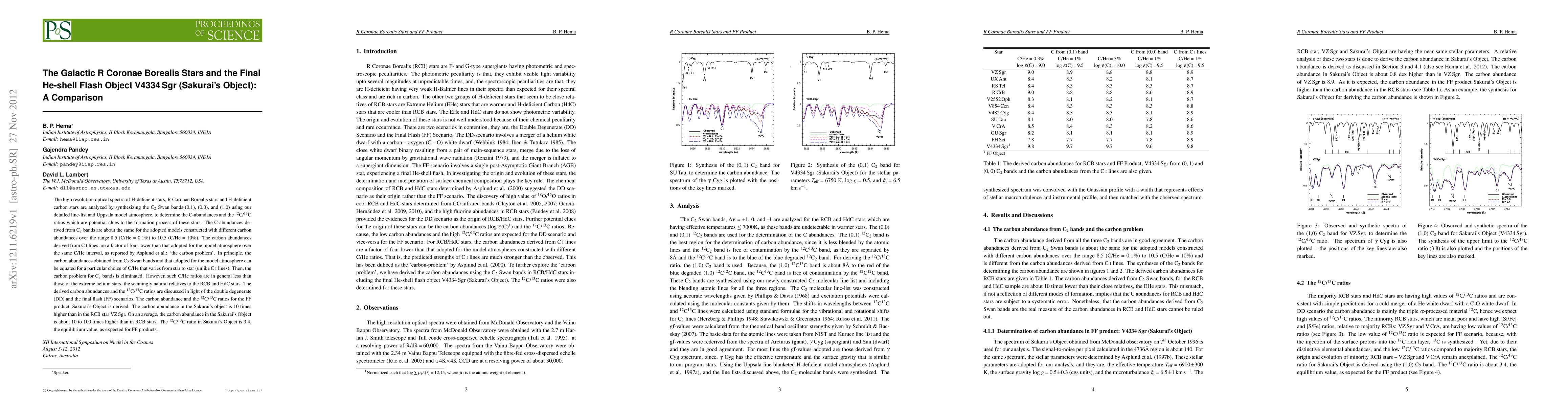 This paper analyzes the high-resolution optical spectra of R Coronae Borealis stars to determine carbon abundances and 12C/13C ratios, comparing the findings to Sakurai's Object (V4334 Sgr). The study finds that carbon abundances derived from C2 Swan bands are significantly higher than those from C I lines, resolving the "carbon problem" for C2 bands. The carbon abundance in Sakurai's Object is notably higher than in typical RCB stars, supporting the final flash scenario.