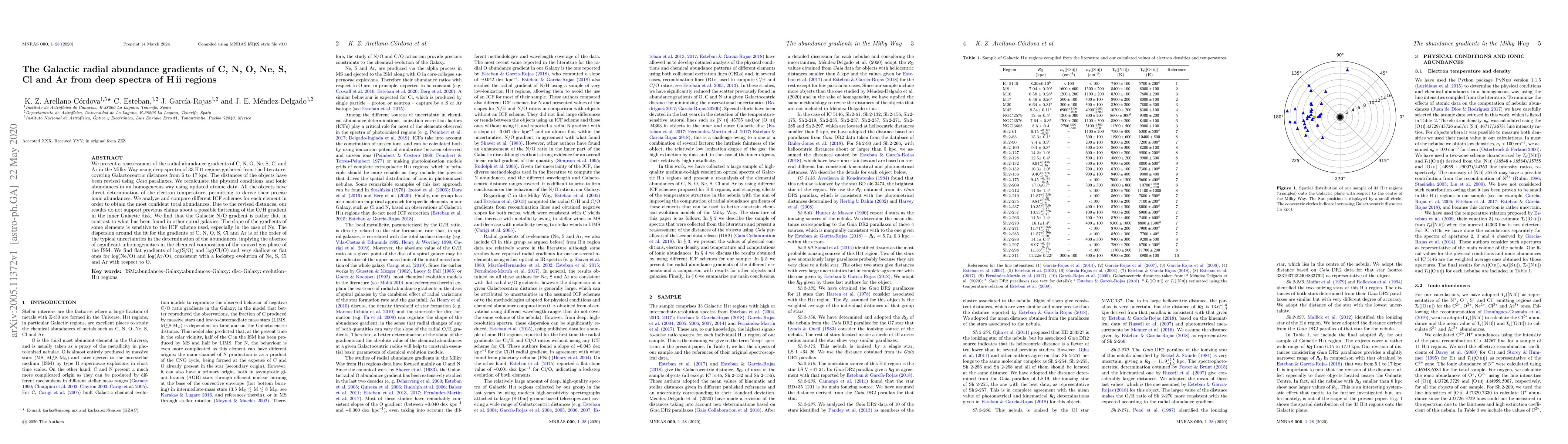 This paper reassesses the radial abundance gradients of C, N, O, Ne, S, Cl, and Ar in the Milky Way using updated data and methods, finding that the gradients for these elements are generally flat, with notable exceptions depending on the adopted correction scheme, and no evidence for a flattening of the O/H gradient.